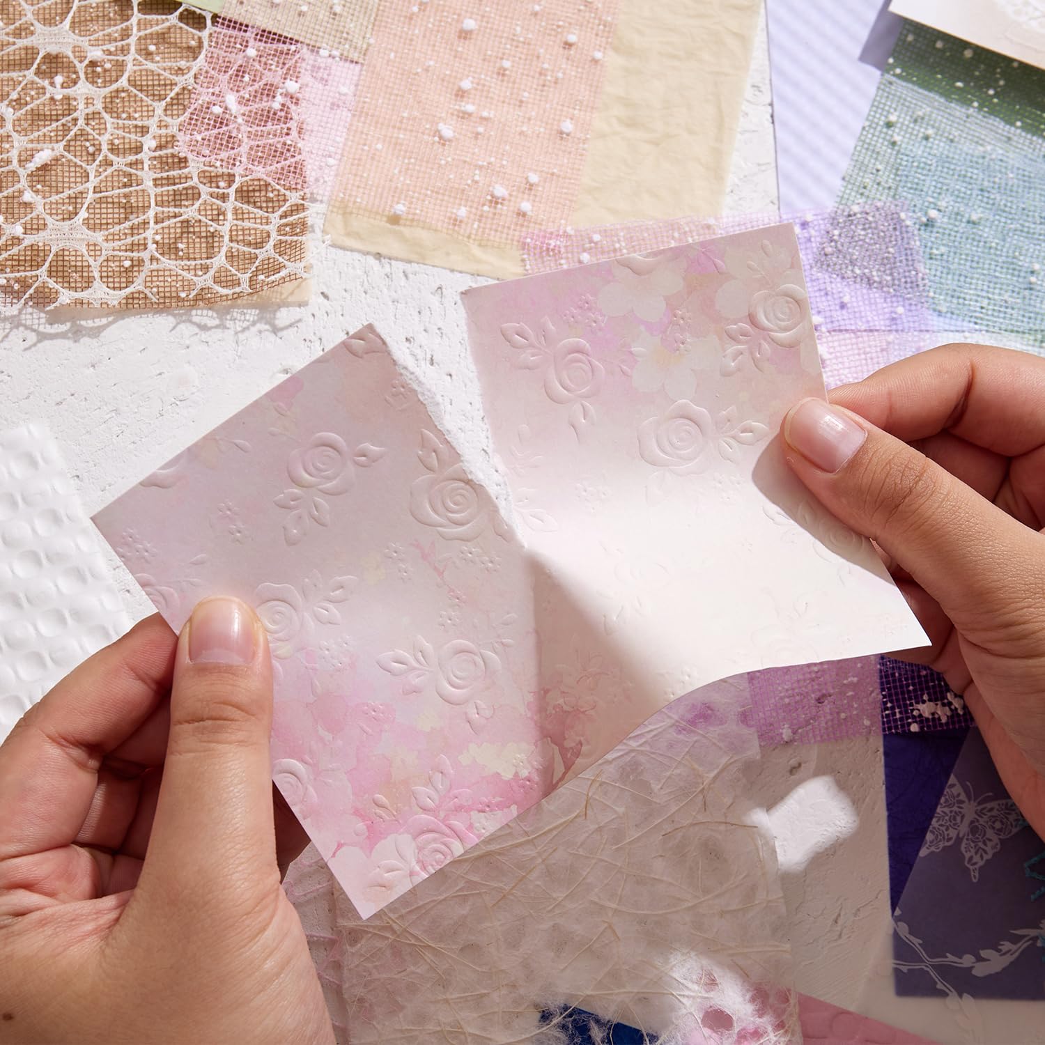 VARIETY OF DESIGNS: Each package comes with 6 pack, 108 pieces assorted textured paper and mesh fabric in various colors, textures and materials.