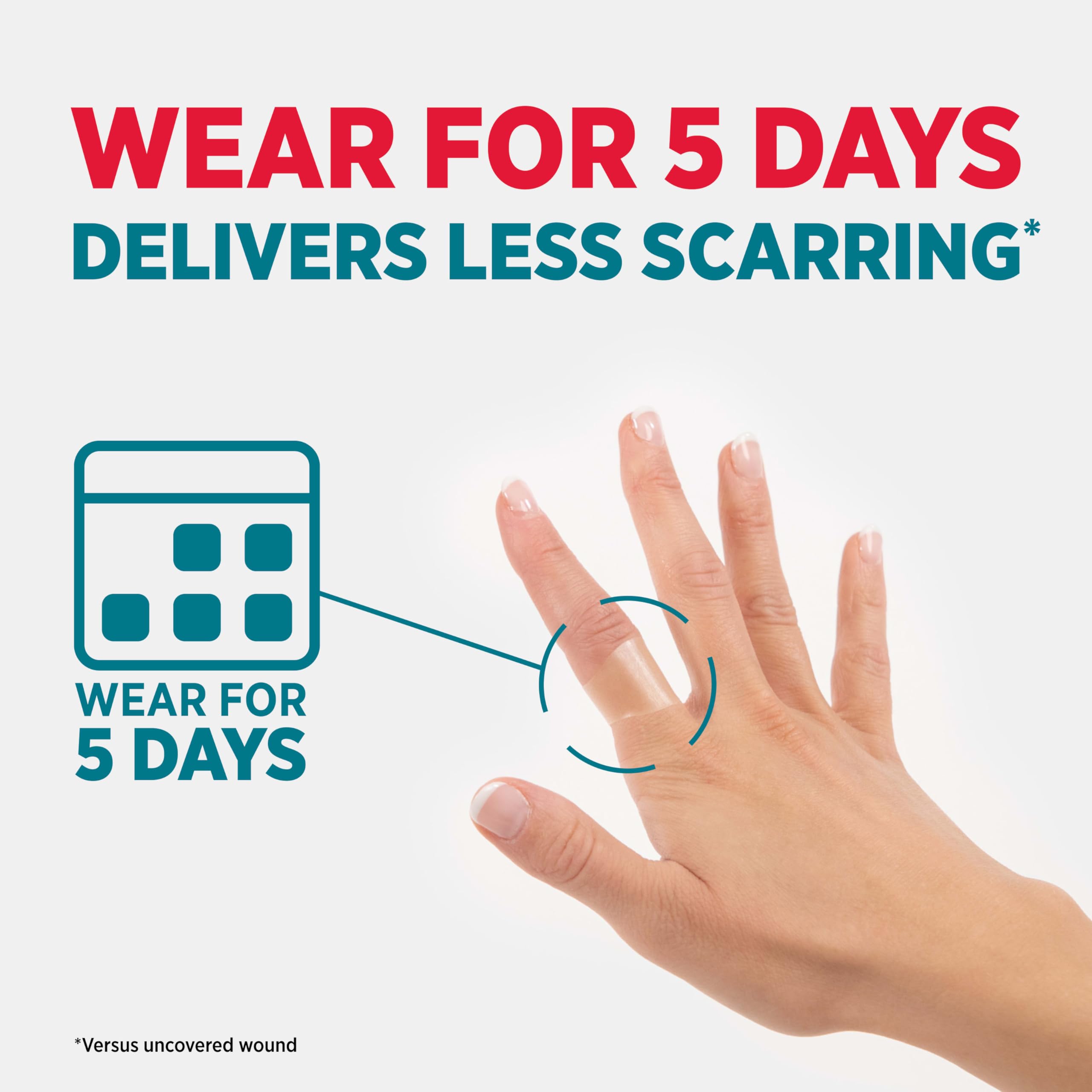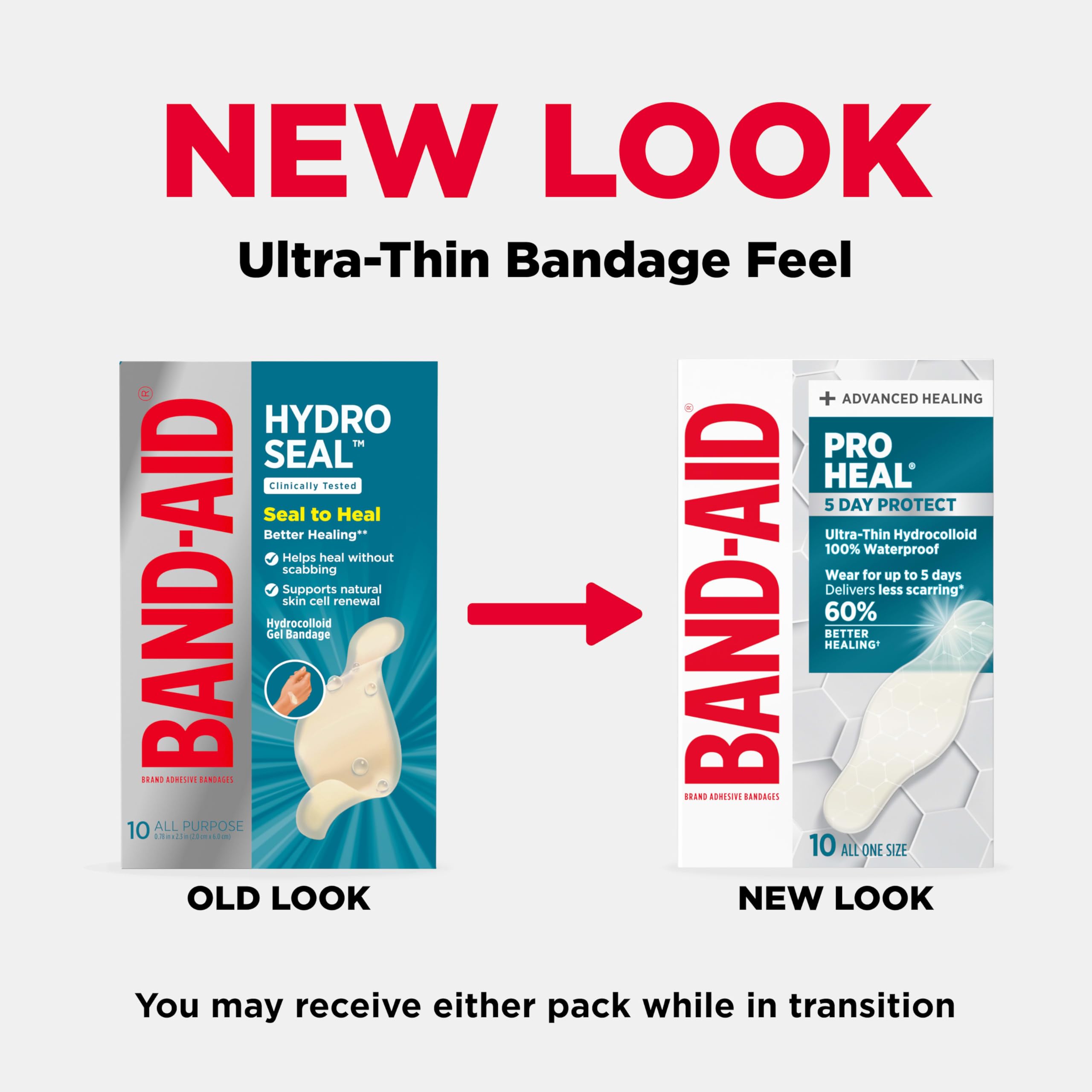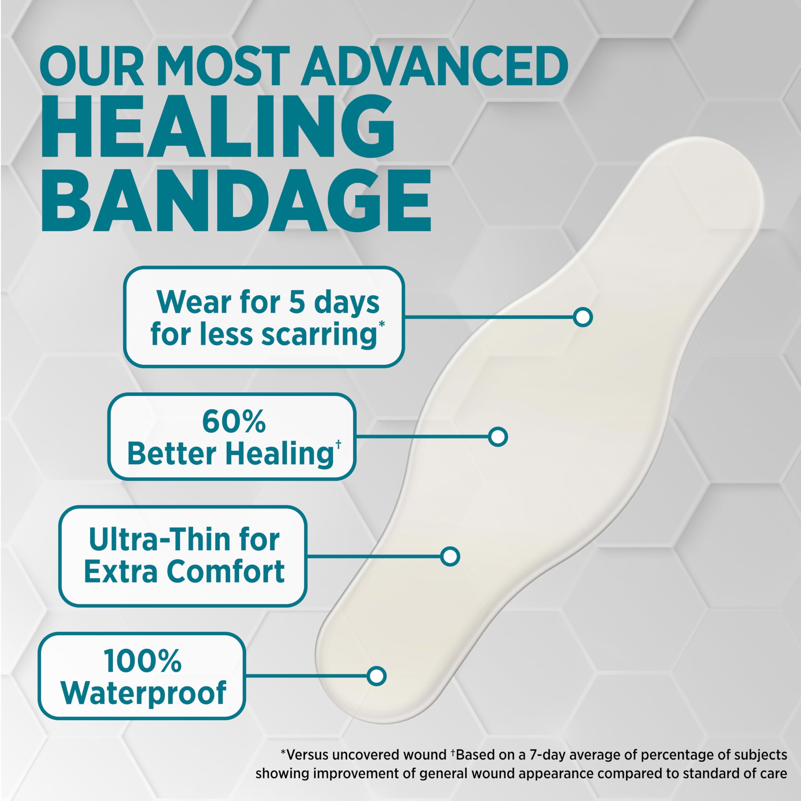 Help heal minor everyday cuts and scrapes better with BAND-AID Brand PRO HEAL Advanced Healing Ultra-Thin Hydrocolloid Bandages. Wear for 5 days for less scarring*. Clinically tested to deliver less scarring* and 60 percent better healing**, these 100 percent waterproof bandages stay in place for up to 5 days, protecting wounds even through handwashing and showering. The advanced healing hydrocolloid bandages absorb fluids, seal out water, dirt, and germs, and maintain an optimal environment for better wound healing. The flexible, ultra-thin material adheres comfortably to fingers, elbows, and knees, and the almost clear bandage blends with skin for a barely there look and feel. Each sterile bandage is individually wrapped for convenient, hygienic use at home or on the go. For best results clean the wound, skip ointment, and leave the bandage on until it starts to lift naturally. *Versus uncovered wound. **Based on a 7-day average of subjects showing improvement vs standard care.