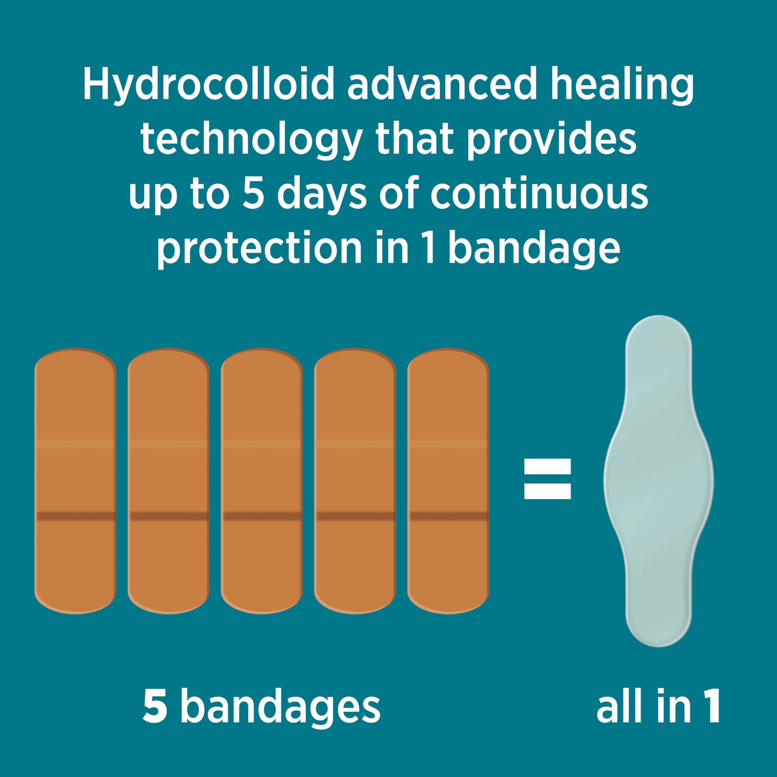 Each bandage features advanced hydrocolloid technology that absorbs fluids, forming a white bubble under the seal as healing begins, and helping protect the wound from water, dirt, and germs while supporting better recovery