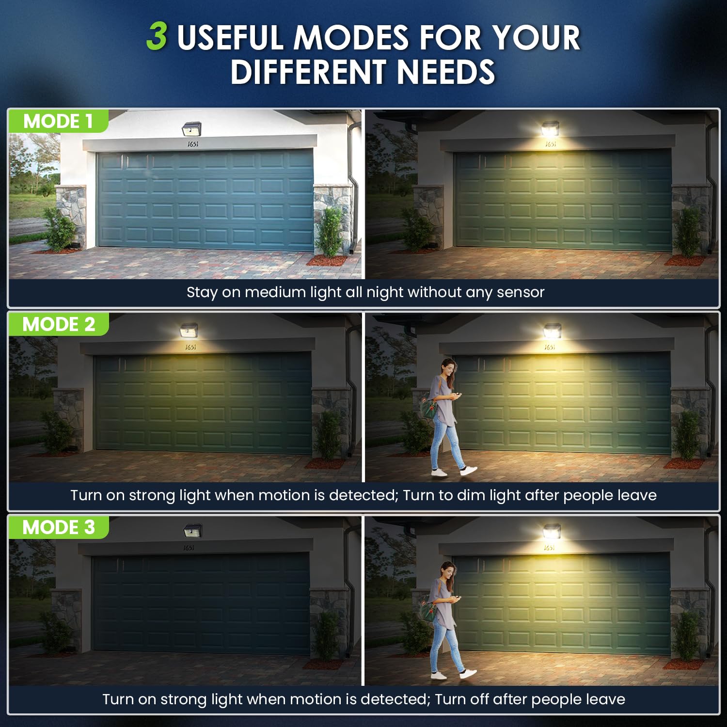 โ๐ ๐๐ฉ๐ญ๐ข๐จ๐ง๐๐ฅ ๐๐ข๐ ๐ก๐ญ๐ข๐ง๐ ๐๐จ๐๐๐ฌ: The upgraded solar stair lights come with 3 smart modes for your daily choice: โ Medium long light mode: the light remains 30% brightness durning the night without sensor โกDim light sensor mode: the light will turn to 100% brightness when motion detection, and turn to 10% brightness after 20s โขStrong light sensor mode: the light will turn to 100% brightness when motion detection, and turn off after 20s. In modes 2 and 3, when motion detection is ongoing, the light will remain at 100% brightness. Additionally, the switch design at the front of the solar light is more convenient for you to change the desired mode at any time.