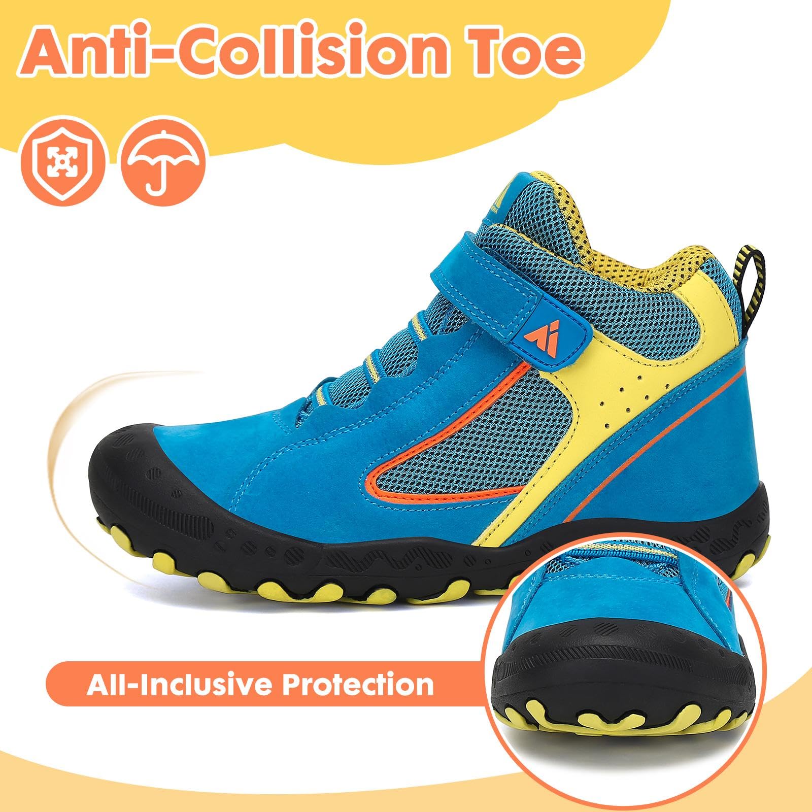 ANTI-COLLISION TOE CAP: Kids hiking boots are with all-inclusive anti-collision rubber toe cap design to protect children's feet safety when playing outdoors.