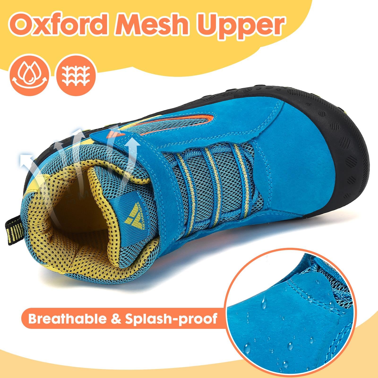 COMFORTABLE UPPER: The Vamp of kids hiking shoes are featured with high-quality PU leather and breathable mesh fabric, which keep kids feet dry and comfortable feeling.