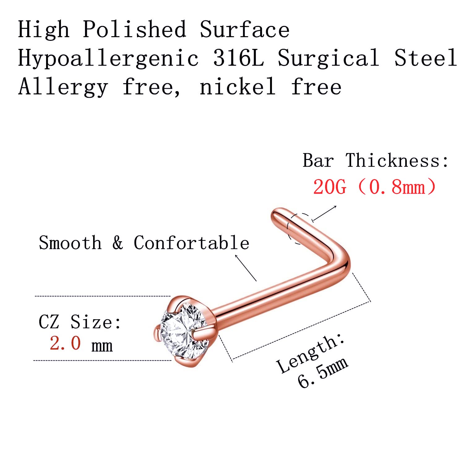 Quantity: 6pcs 2.0mm CZ nose stud. This L shaped nose studs for women size: Bar thickness: 20 gauge (0.8mm), Pin Length:6.5mm, Prong set cubic zirconia: 2.0mm, These stones a very bright and prong set by hand for accuracy.
