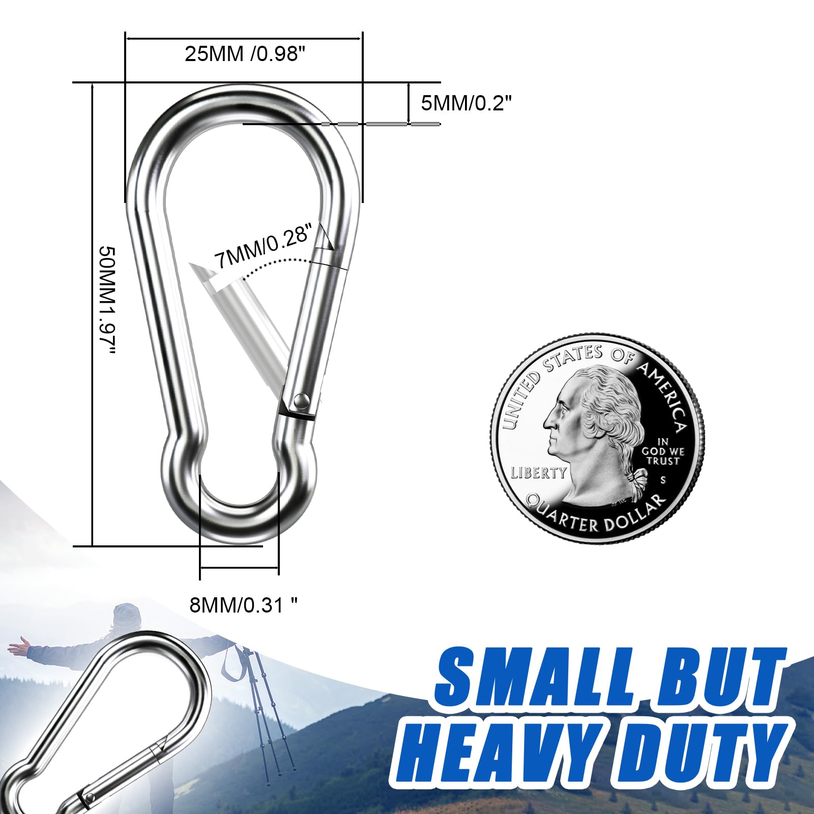 【High Quality material】KINLINK small carabiner is made of high-quality 304 stainless steel, which is strong, waterproof, rust-proof, wear-resistant, corrosion-resistant and high-strength, making the stainless steel carabiner clip durable and allowing you to use it with peace of mind for a long time.