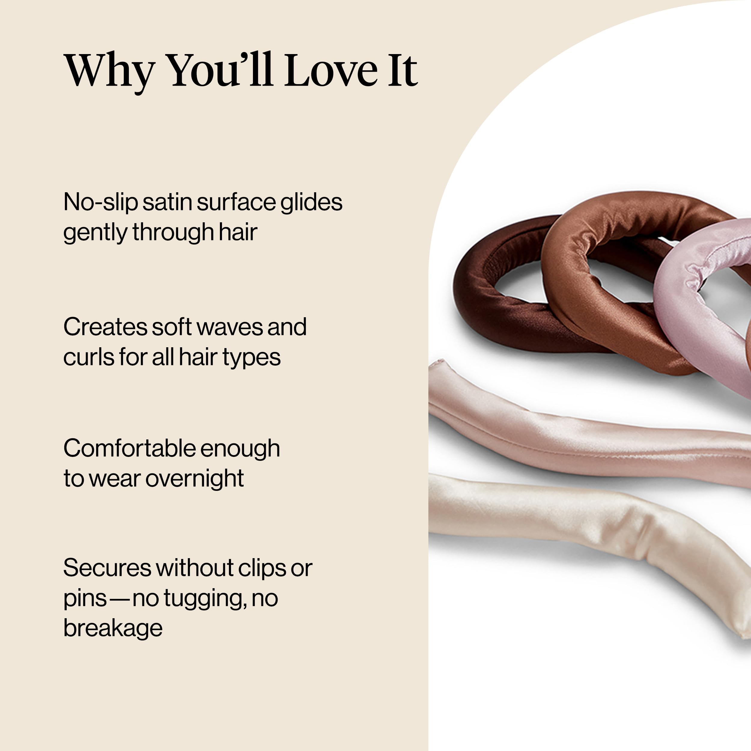 COMFORTABLE & CONVENIENT FOR OVERNIGHT USE: Designed to be soft and gentle, our 100% vegan satin material ensures no friction or tugging on your hair, making it comfortable to wear overnight. Unlike other curlers that can slide out or cause discomfort, our flexible rods stay securely in place when wrapped correctly, even while you sleep - enabling you to wake up to beautiful, frizz-free curls.