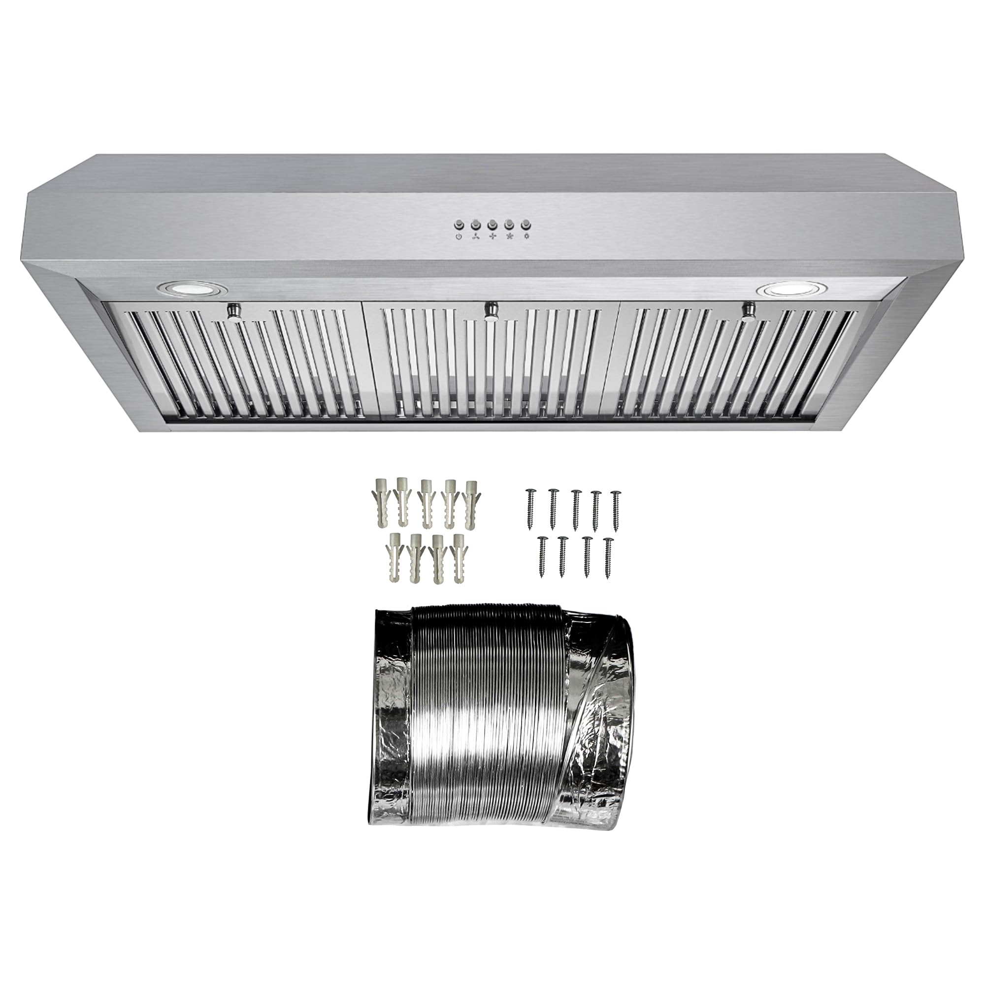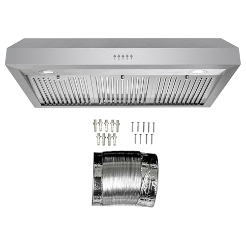 EFFICIENT AIRFLOW: 380 CFM with 3 fan speeds and push-button controls, this Cosmo under cabinet range hood quickly and ventilates your kitchen to reduce smoke, grease, and odors. Range Hood comes standard ducted. Noise level as low as 45 dB on lowest fan speed with rigid ducting (sold separately) under optimal conditions; range hood comes with flexible ducting for convenient installation