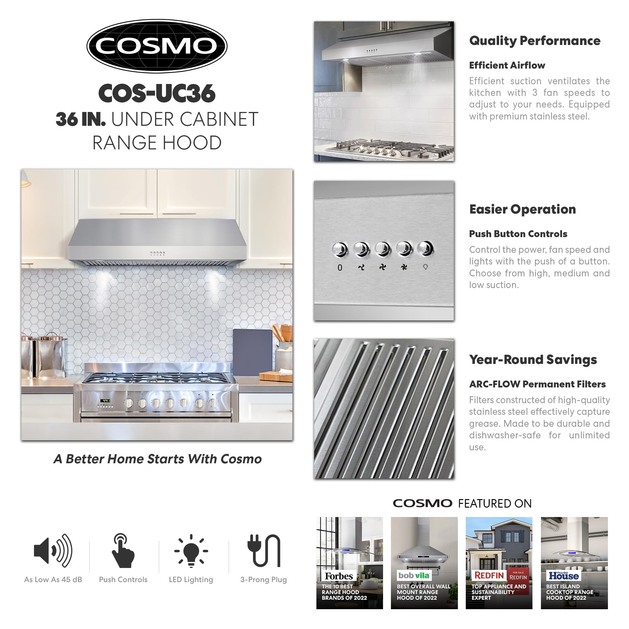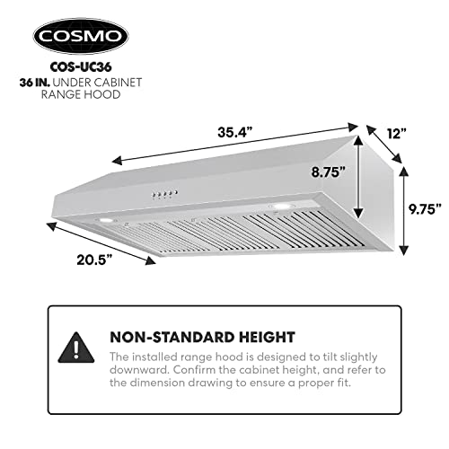 Made with professional styling, Cosmo's UC36 under cabinet range hood has a modern and minimalist design. 3 fan speeds, up to 380 CFM, is available at your fingertips for high-powered kitchen ventilation. Energy efficient LEDs can be enabled with the simple push-button controls. Clean up is a breeze with easily removable, permanent, dishwasher safe stainless steel filters. A 120V 3-prong power cord is included for easy installation. Cosmo appliances put professional quality in your home for factory direct prices. Part of the Haven Collection bringing enhanced functionality and design, offering a well-rounded option for those looking for more convenience and style in an appliance.
