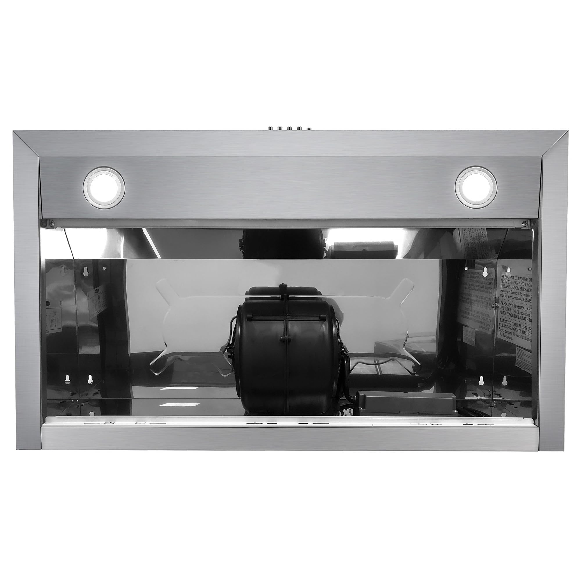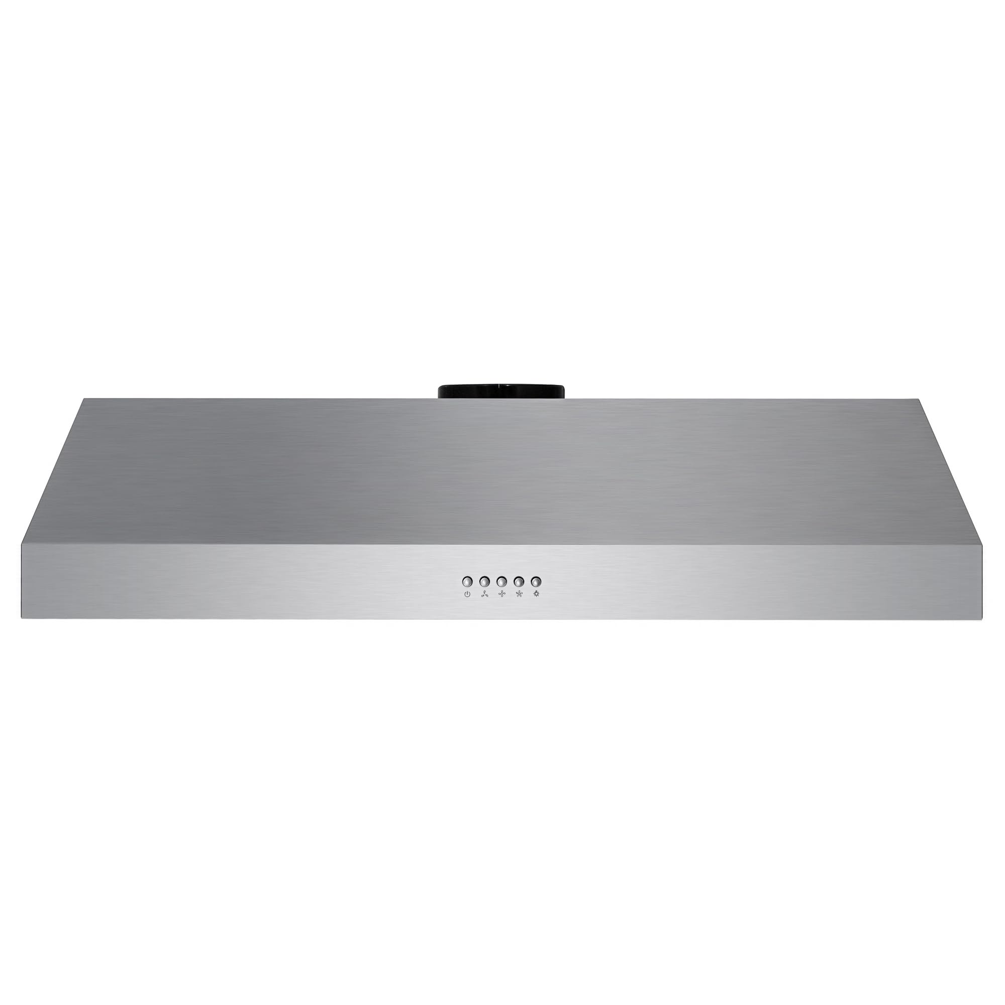 PUSH BUTTON CONTROLS: Range hood equipped with push button control panel to manage multiple functions, including fan speed, lights and power