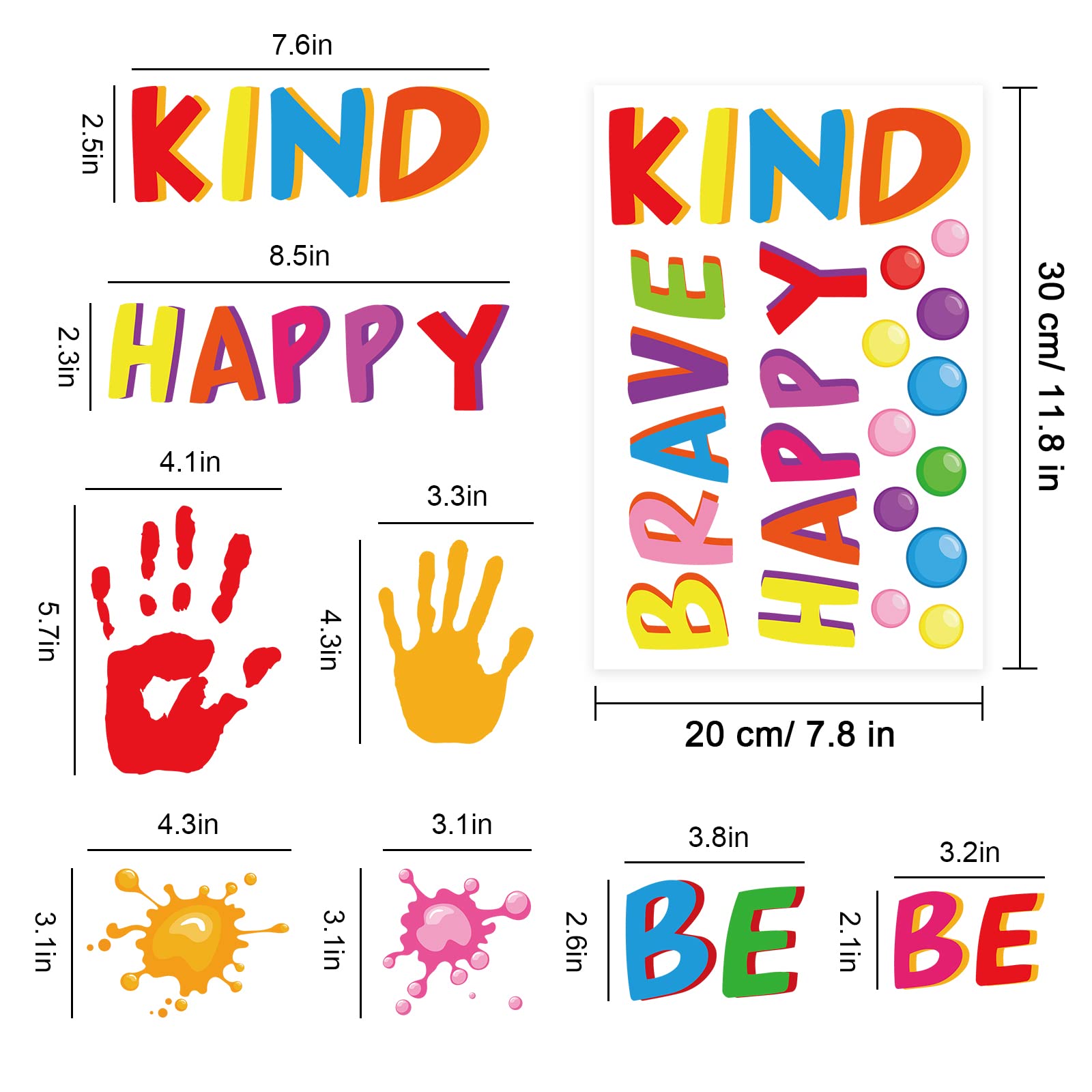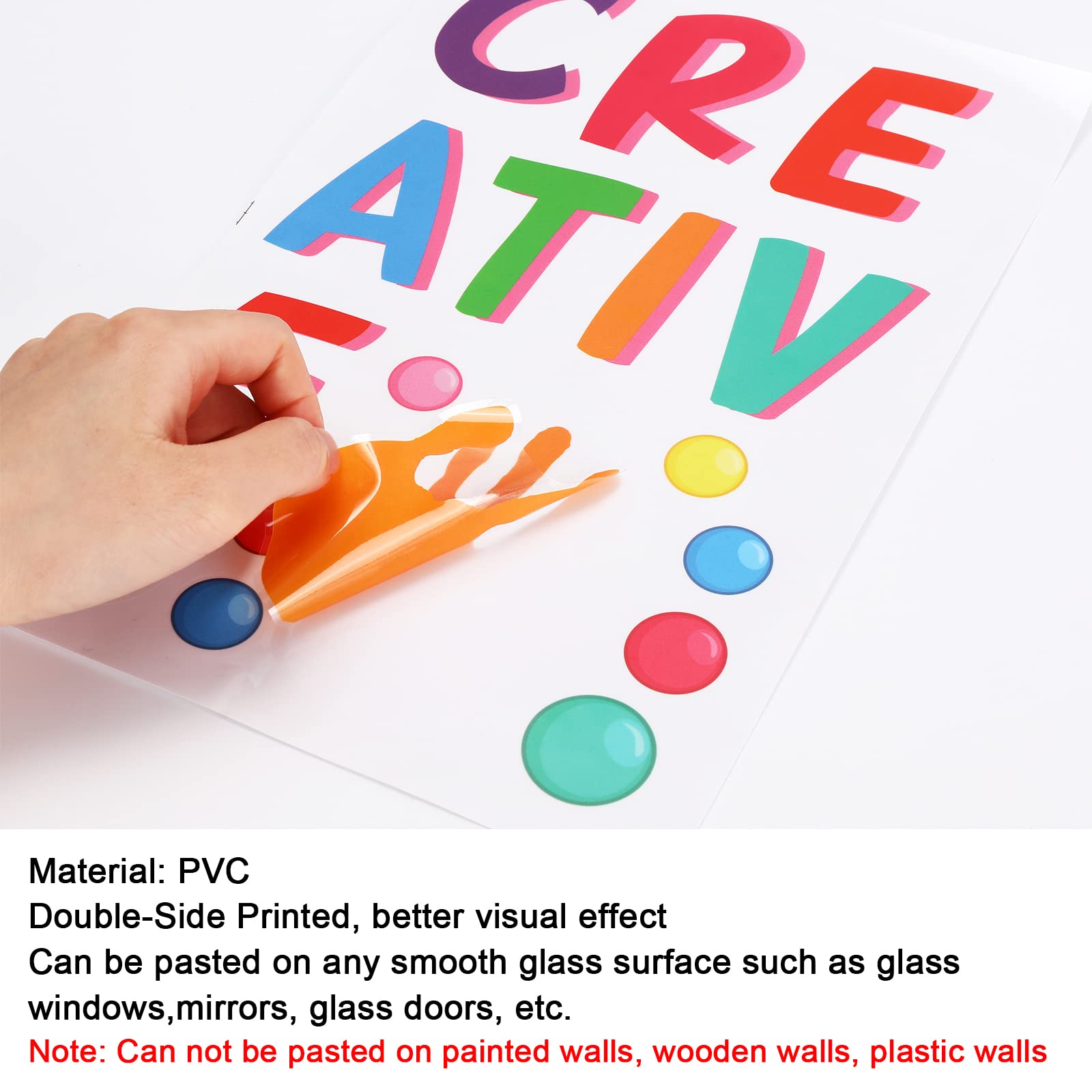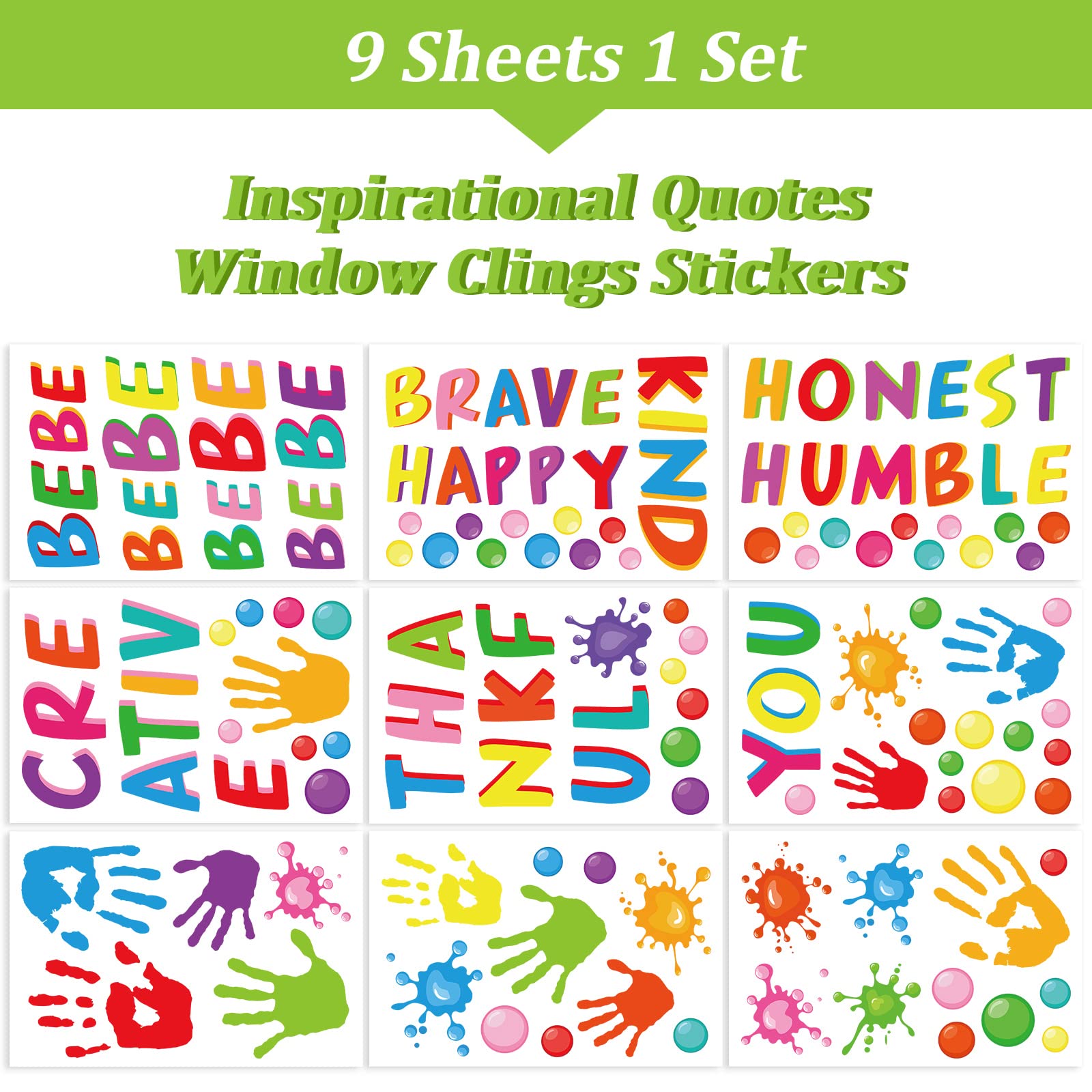 Inspirational Designs - 9 sheets window clings are all in different designs and colors, each sheet measures 20 x 30cm / 7.8 x 11.8inch, printed with inspirational quotes and colorful handprint and polka dots patterns, let everyone know good personalities and bravely believe in themselves.