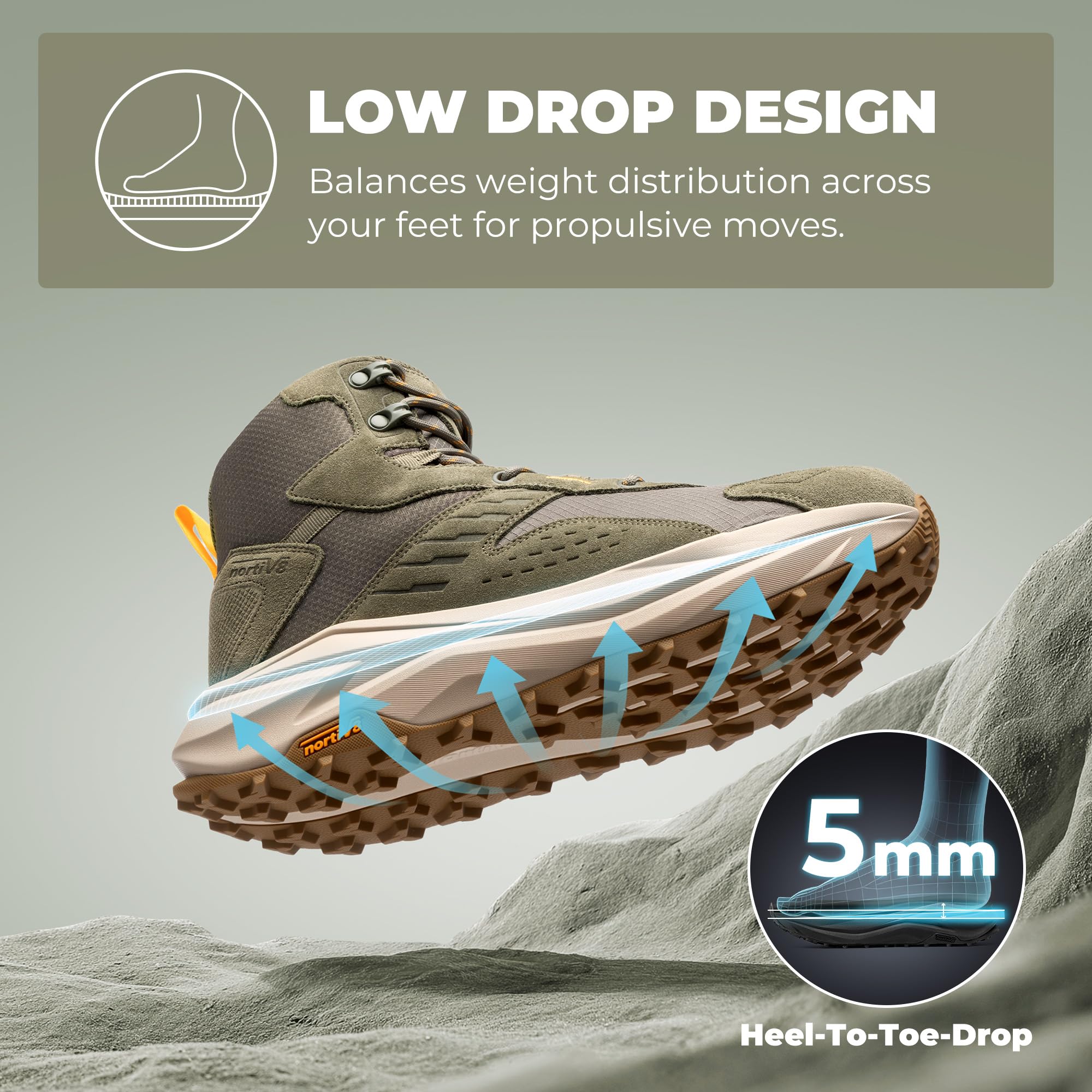 Low Drop Design: With a 5-mm heel-to-toe drop, these waterproof hiking boots for men keep your feet in a natural position while balancing weight distribution and reduces pressure on the forefoot.