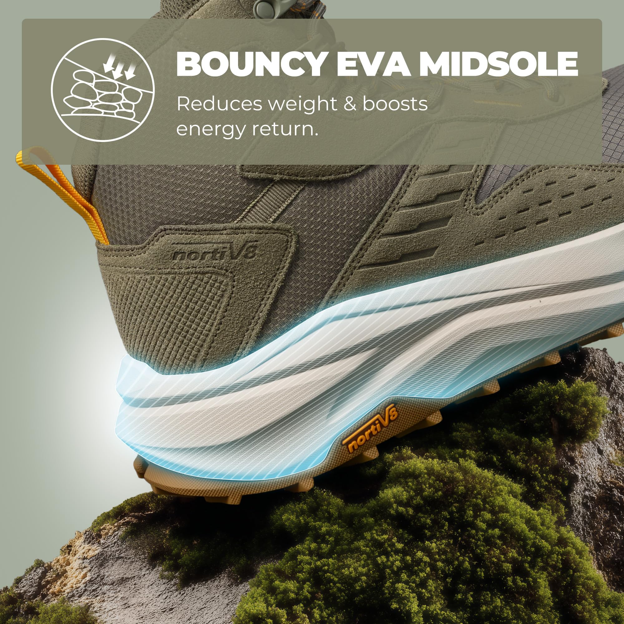 Comfortable & Slip-Resistant: These men's boots boast a thick EVA midsole that offers bouncy support with every step. The lugged rubber outsole ensures you stay grounded on challenging terrains.