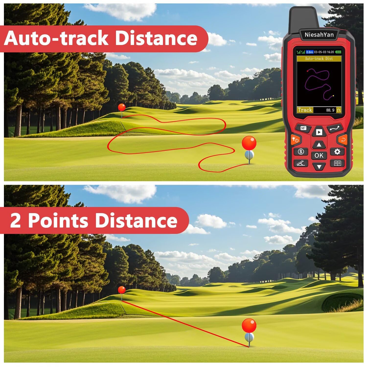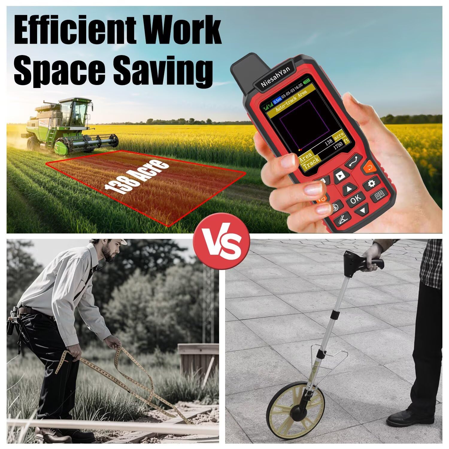 TIPS: Recommended to measure an area above 0.16 acres and distance above 328 ft. The larger the measurement range, the smaller the error.The device needed to be held horizontal when measuring