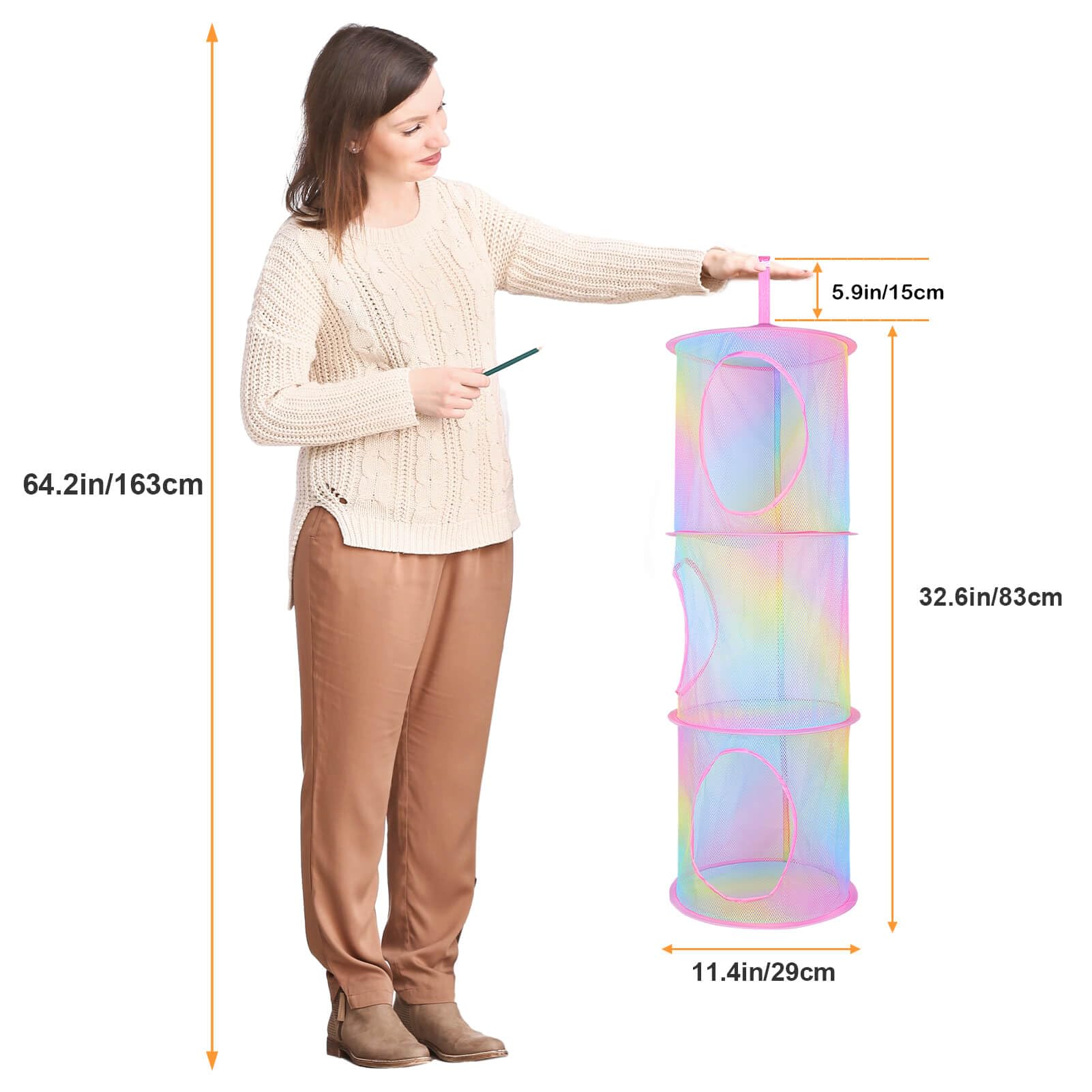Size and Package: Stuffed animals organizer holder 3 tiers size is 11.4 " x 11.4 " x 32.6 ", 4 tiers size is 11.4 " x 11.4 " x 43.3 ", 5 tiers size is 11.4 " x 11.4 " x 55 ", top with wide loop, easy to open and close, for hanging; No special installation is required, and hanging it on a hook or a closet at will, the package contains 2 pcs of stuffed animals storage
