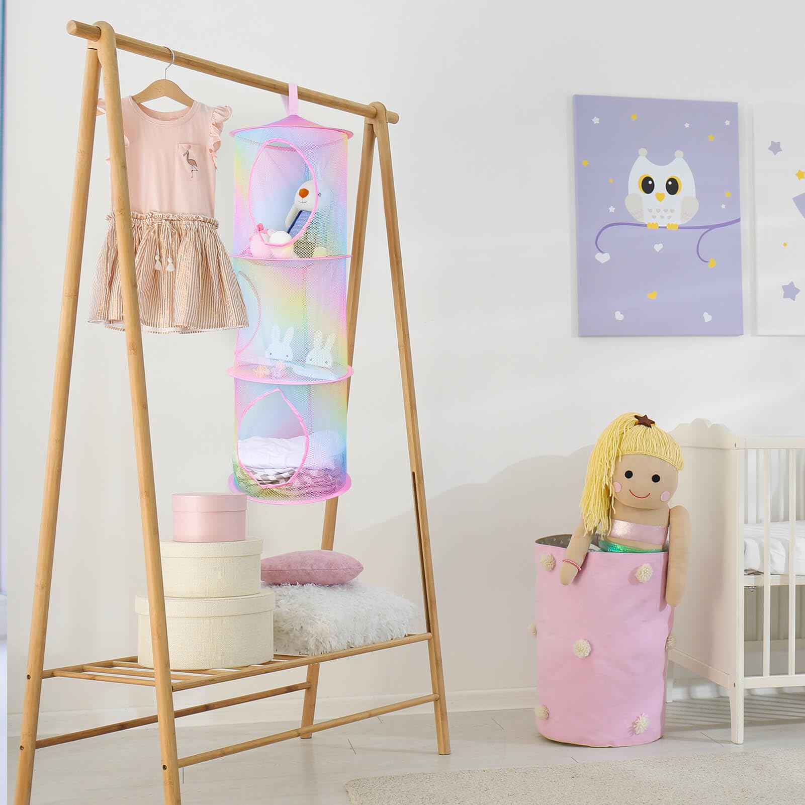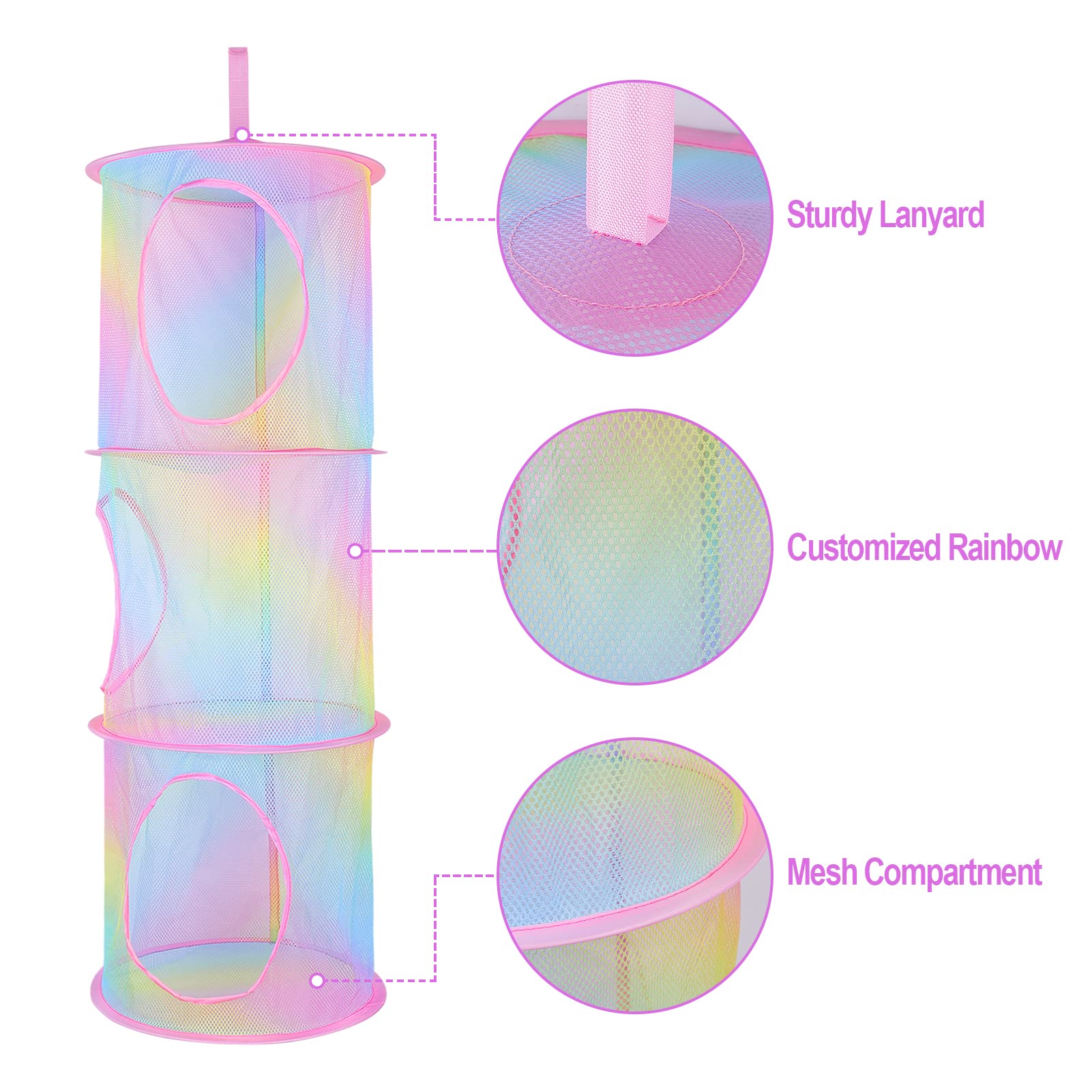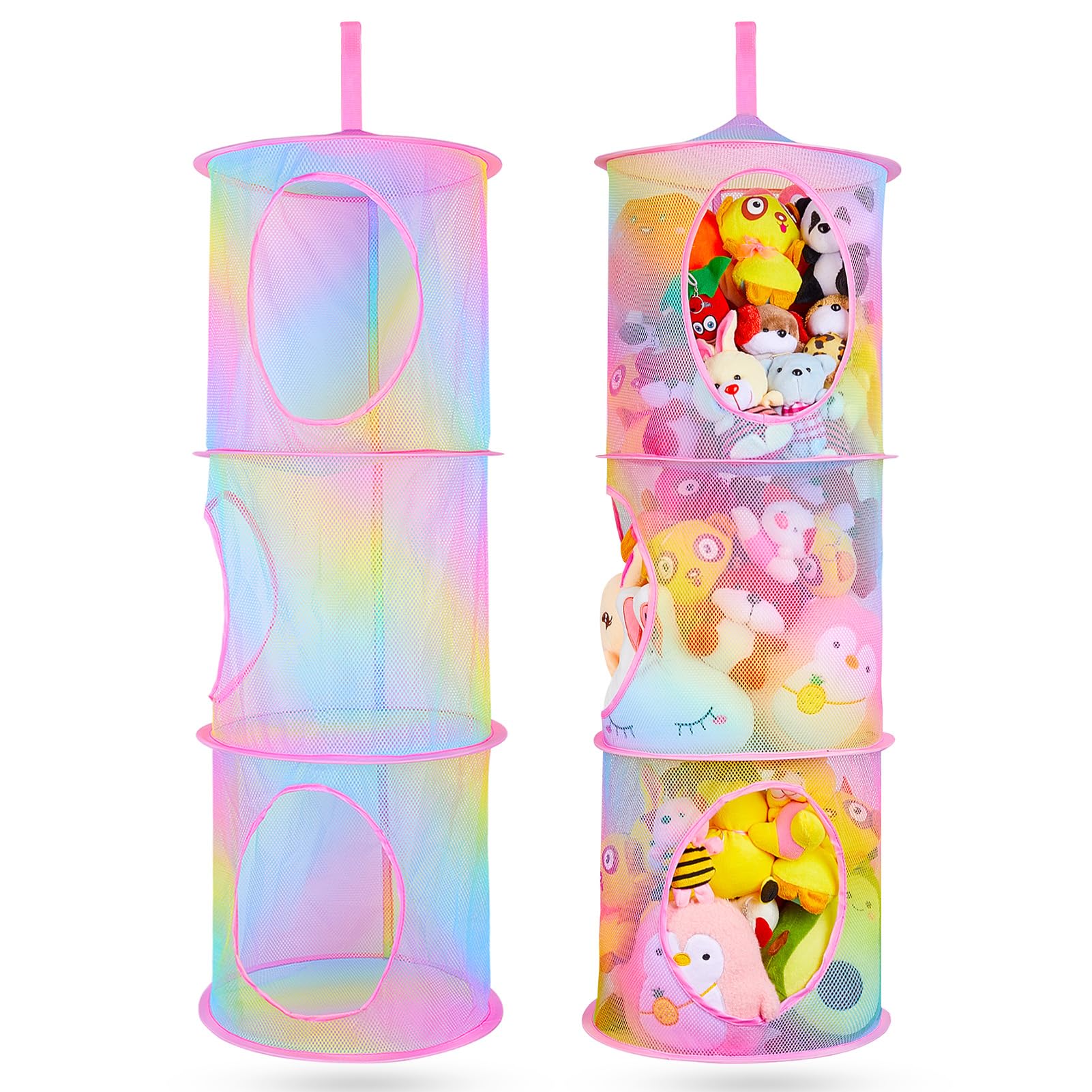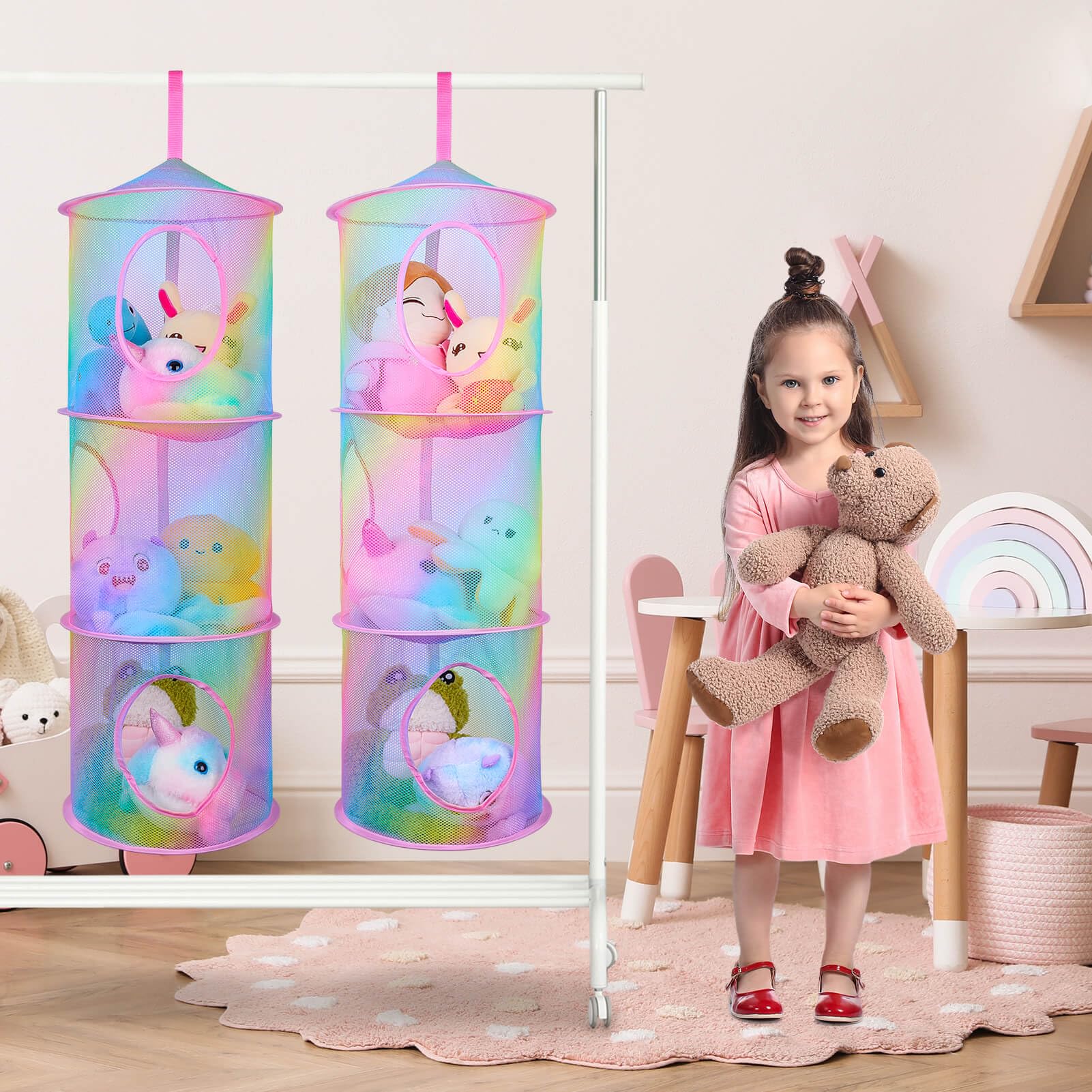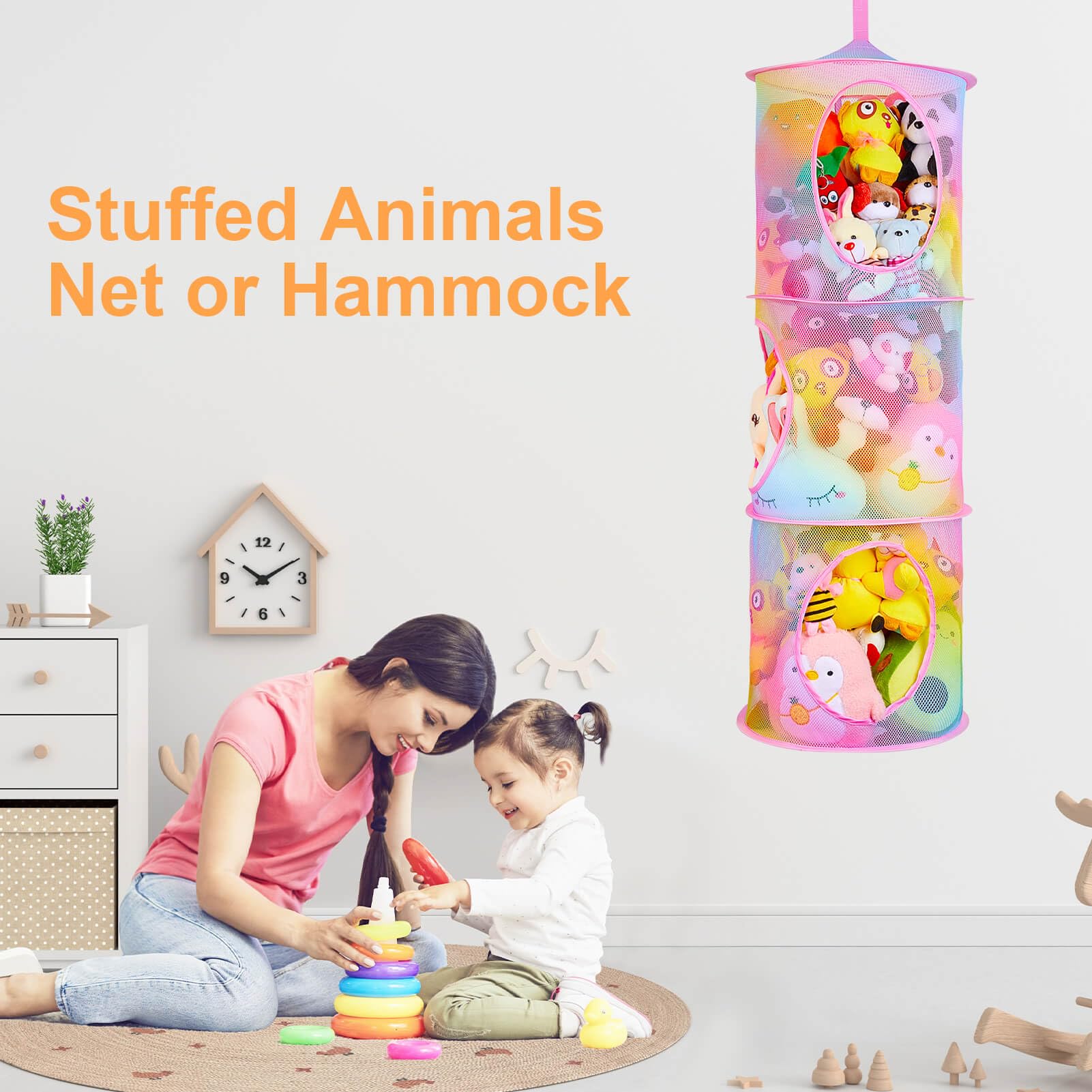 Stuffed Animals Storage: Creative collapsible design and customized unique colors, hanging use and maximizes utilization of standing space, different direction for putting items, convenient to use, easy fold when not use, saving space