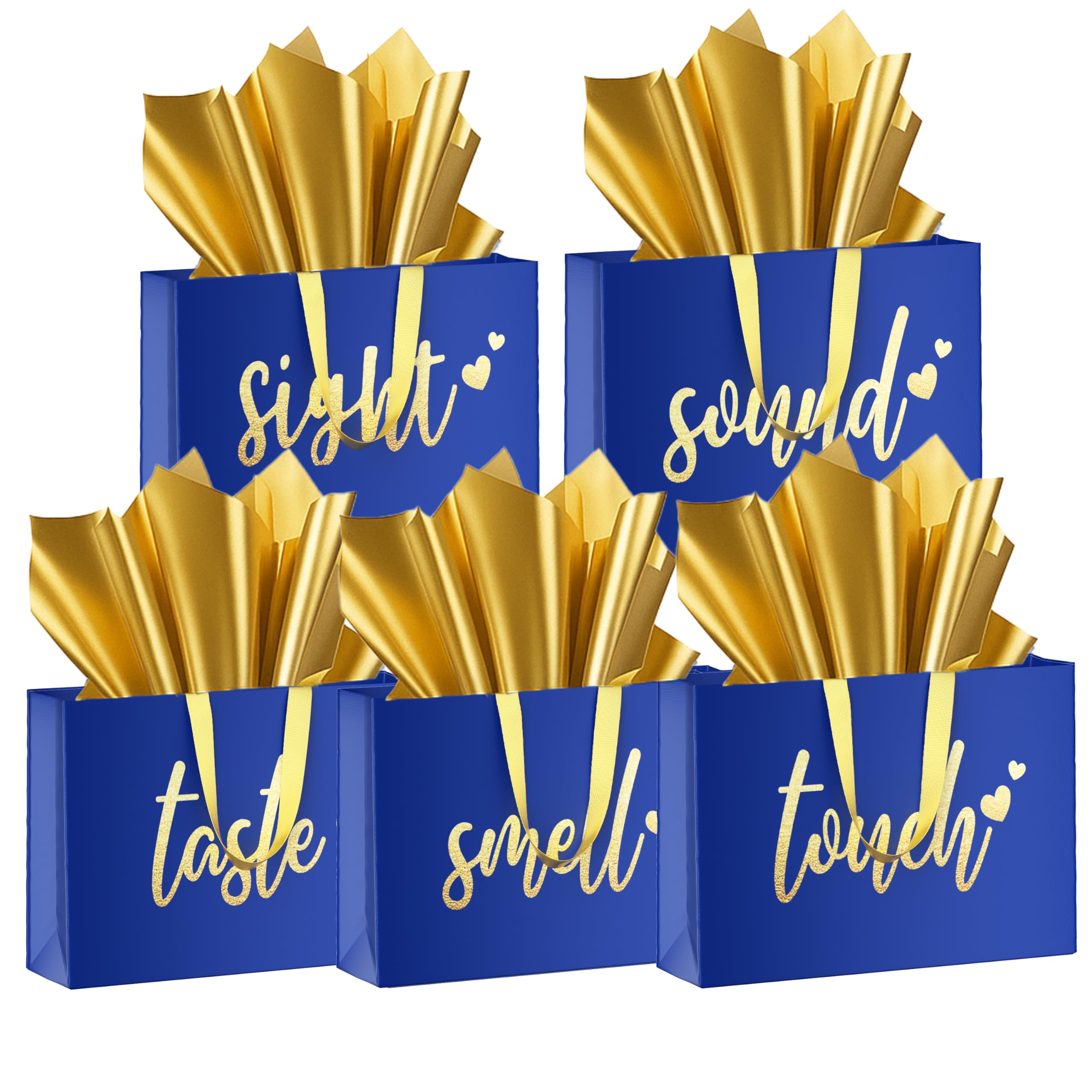 Size details: each sense gift bags measures 12.6 x 8.7 x 4 inches while accompanying tissue papers measure 19.7 x 26 inches, designed to accommodate uniquely shaped gifts, these 5 senses gift bags will help you create the great set of presents, and to show your love and add the last touch to your present