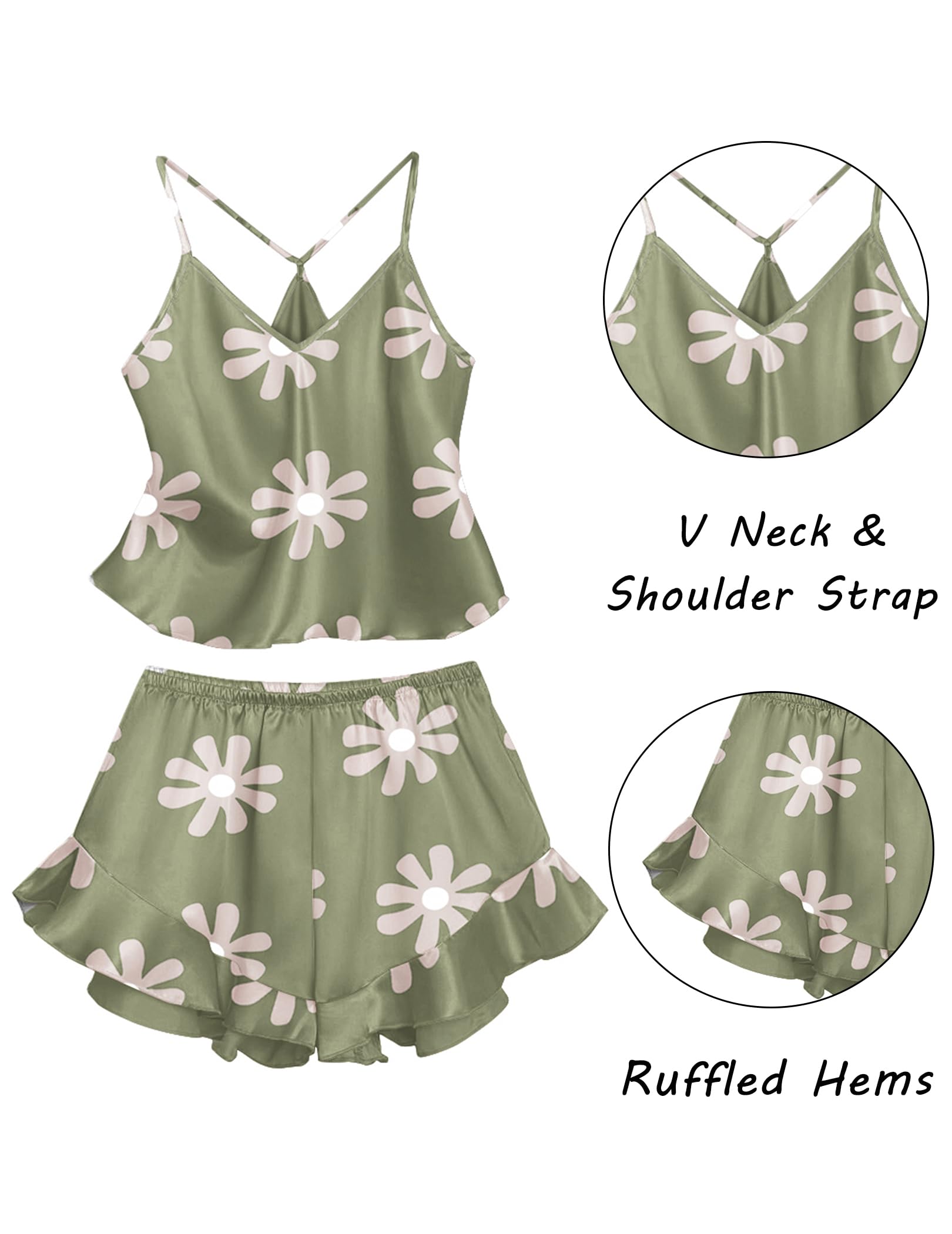 FEATURES: Cute satin pj set for women features a v-neck top,special design shorts of lovely ruffled with comfortable elastic, and there are a variety of printed styles for you to choose from.