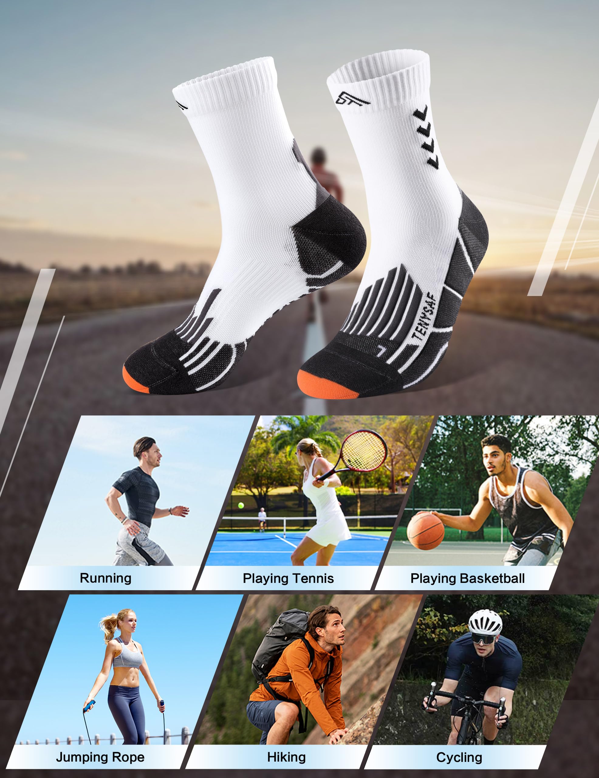 Compression & Arch Support Design:The running socks provide about 35mmHg of compression,graduated compression technology promotes better blood circulation and muscle fatigu, prevent injury. Arch support design could enhance stability and reduce stress. So you will feel comfortable and safe during running, jogging, hiking baseball and other athletic activities.