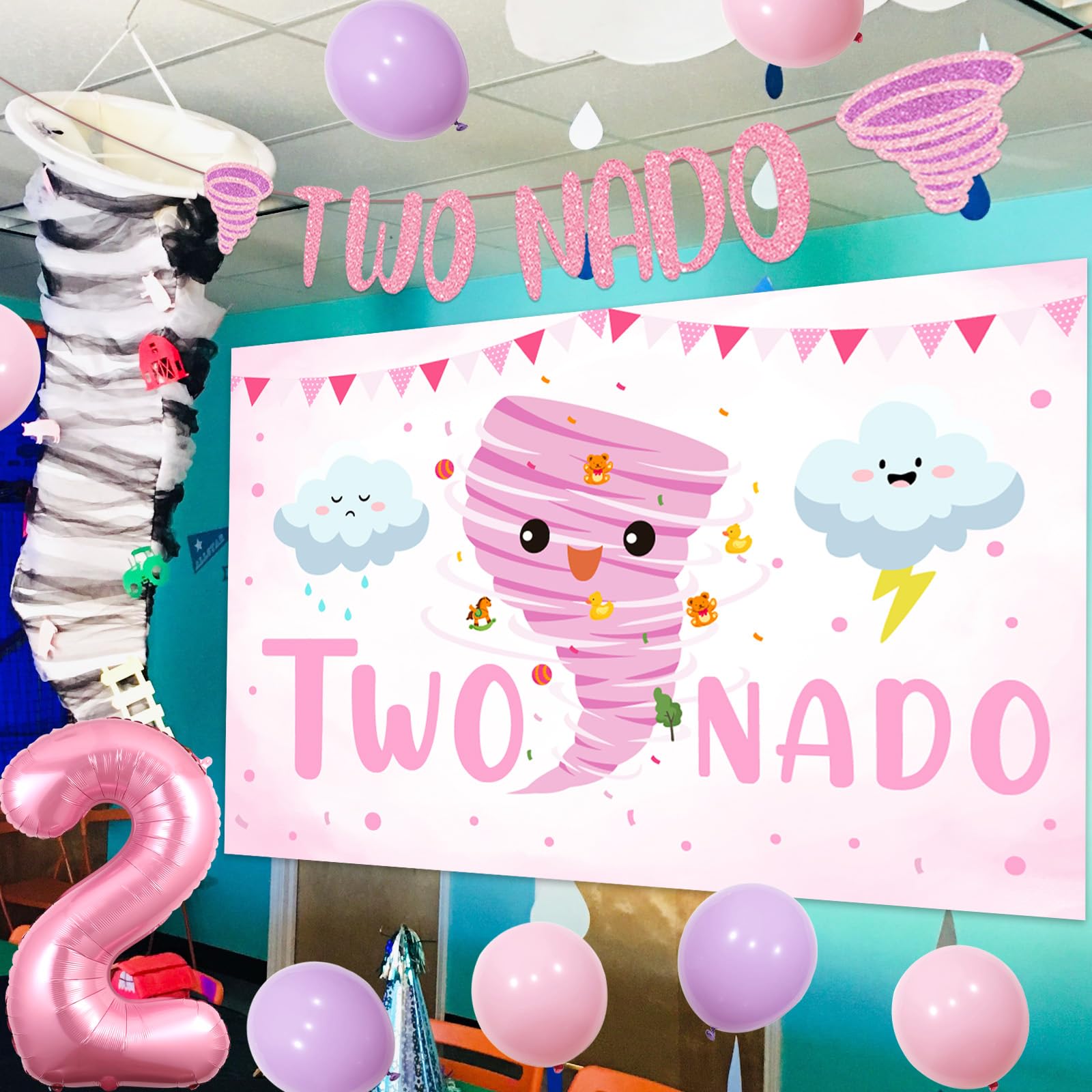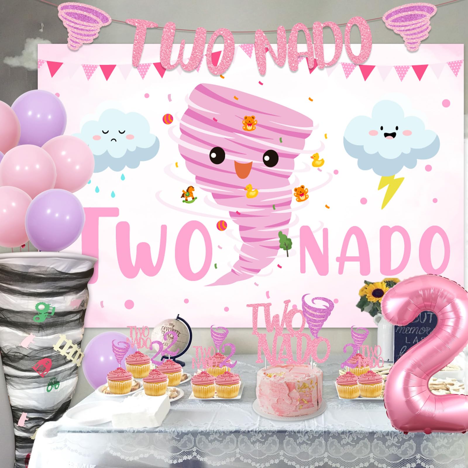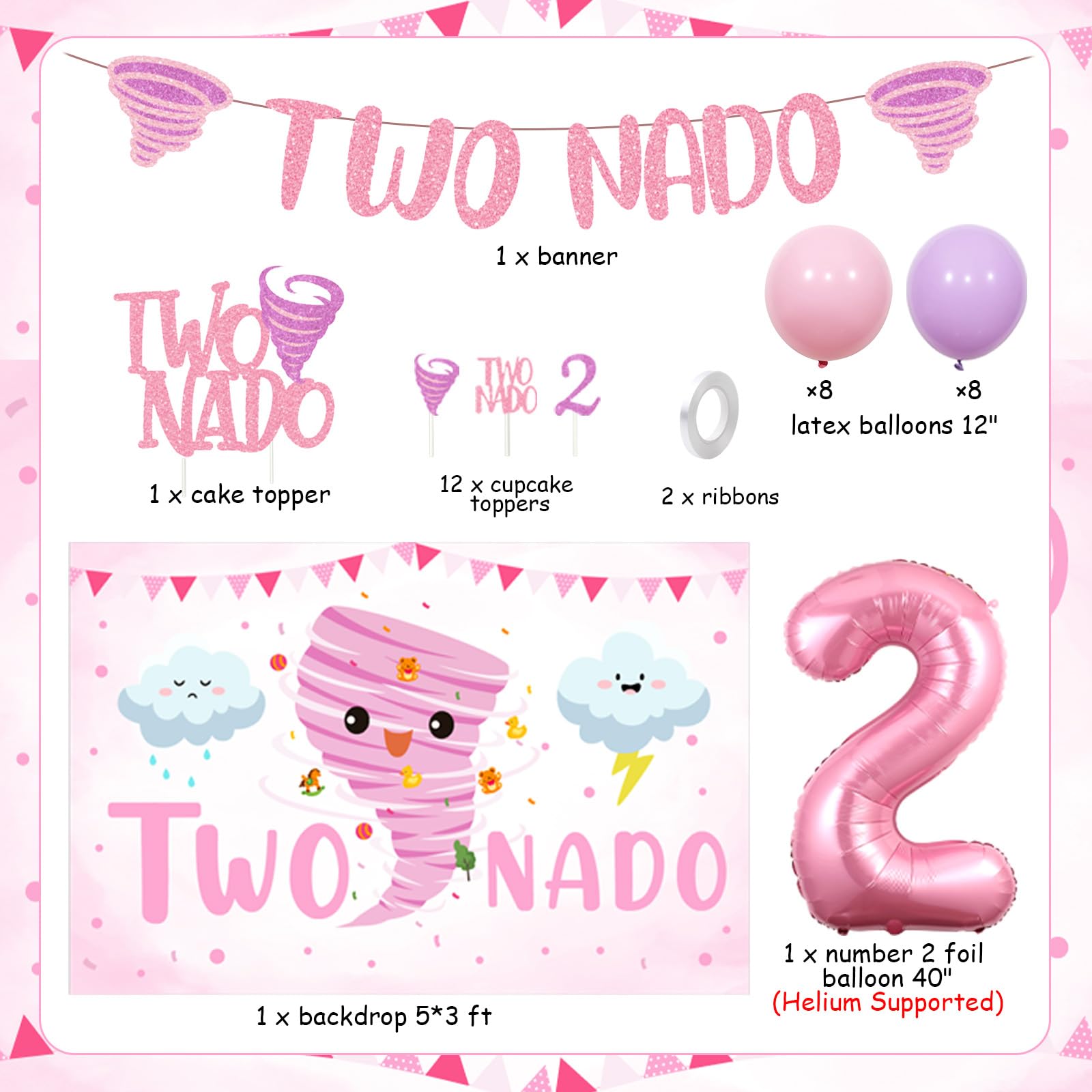Two Nado Birthday Party Decorations: Package includes 16*12 inches latex balloons, 1*40 inches number 2 foil balloon, 1 “TWO NADO” backdrop 5*3ft, 1 “TWO NADO” banner, 1 “TWO NADO” cake topper, 12 cupcake toppers and 2 white ribbons 33ft.
