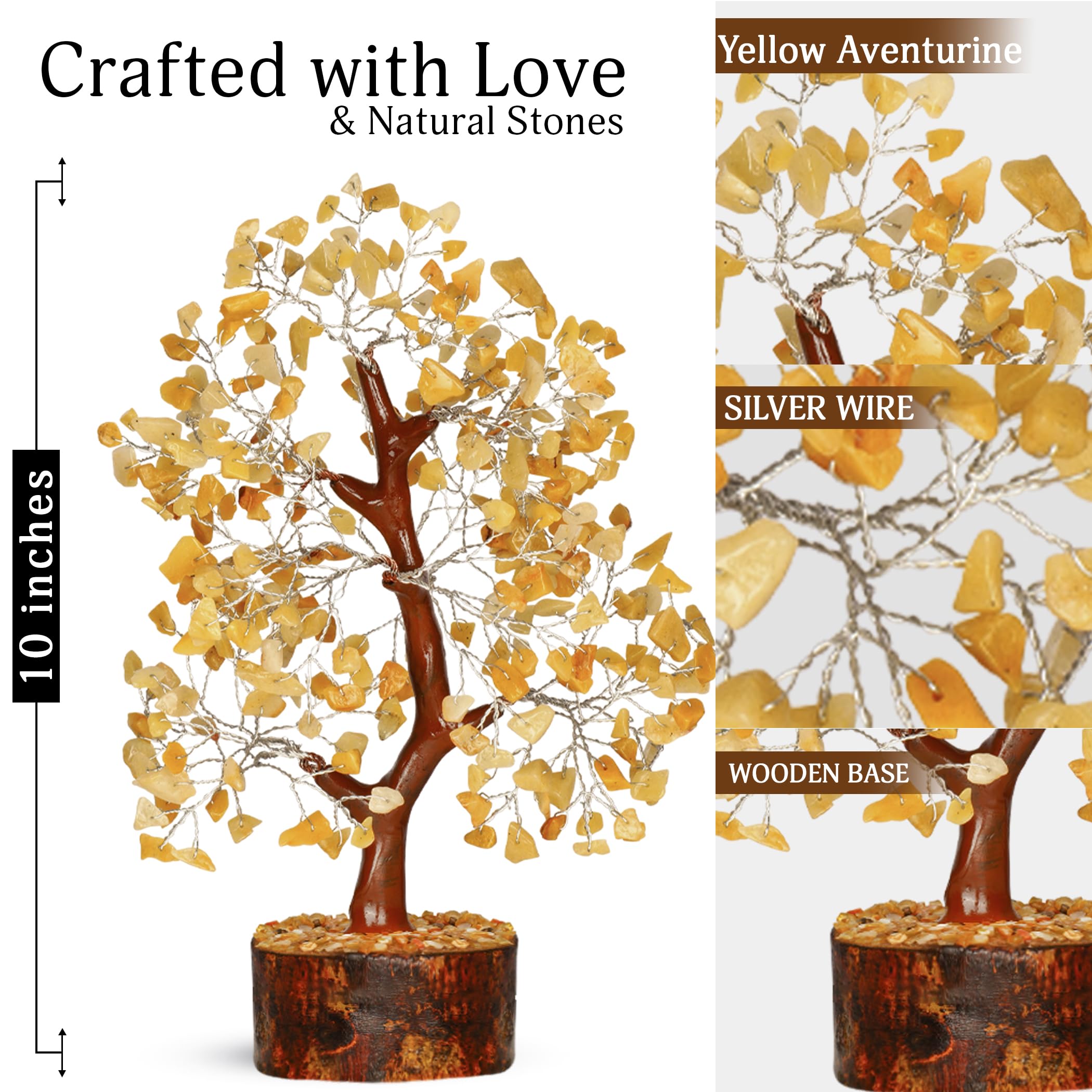 Yellow Aventurine Gemstone Tree - A beautifully handcrafted tree with Yellow Aventurine Gemstones coupled with a wooden base and silver wire trunk covered with M seal. This crystal tree is approximately 10-12 inches. Something simply beautiful like a yellow aventurine crystal tree can create a space where energy can freely flow and also attract good things. The presence of buddha tree can enhance the surrounding environment with a calm and enhancing environment.