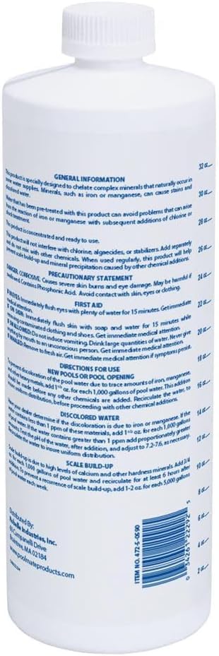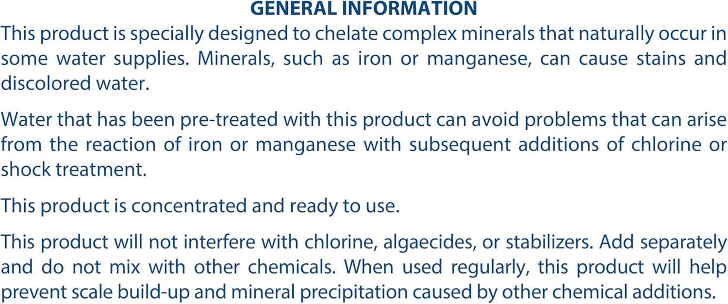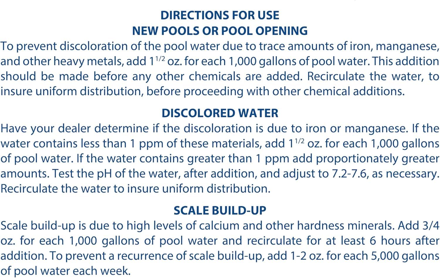 This product is specially designed to chelate complex minerals that naturally occur in some water supplies. Minerals, such as iron or manganese, can cause stains and discolored water. Water that has been pre-treated with this product can avoid problems that can arise from the reaction of iron or manganese with subsequent additions of chlorine or shock treatment. This product is concentrated and ready to use. This product will not interfere with chlorine, algaecides, or stabilizers. Add separately and do not mix with other chemicals. When used regularly, this product will help prevent scale build-up and mineral precipitation caused by other chemical additions. New Pools or Pool Opening: To prevent discoloration of the pool water due to trace amounts of iron, manganese, and other heavy metals, add 11/2 oz. for each 1,000 gallons of pool water. This addition should be made before any other chemicals are added. Recirculate the water, to insure uniform distribution, before proceeding with other chemical additions. Discolored Water: Have your dealer determine if the discoloration is due to iron or manganese. If the water contains less than 1 ppm of these materials, add 11/2 oz. for each 1,000 gallons of pool water. If the water contains greater than 1 ppm add proportionately greater amounts. Test the pH of the water, after addition, and adjust to 7.2-7.6, as necessary. Recirculate the water to insure uniform distribution. Scale Build Up: Scale build-up is due to high levels of calcium and other hardness minerals. Add 3/4 oz. for each 1,000 gallons of pool water and recirculate for at least 6 hours after addition. To prevent a recurrence of scale build-up, add 1-2 oz. for each 5,000 gallons of pool water each week.