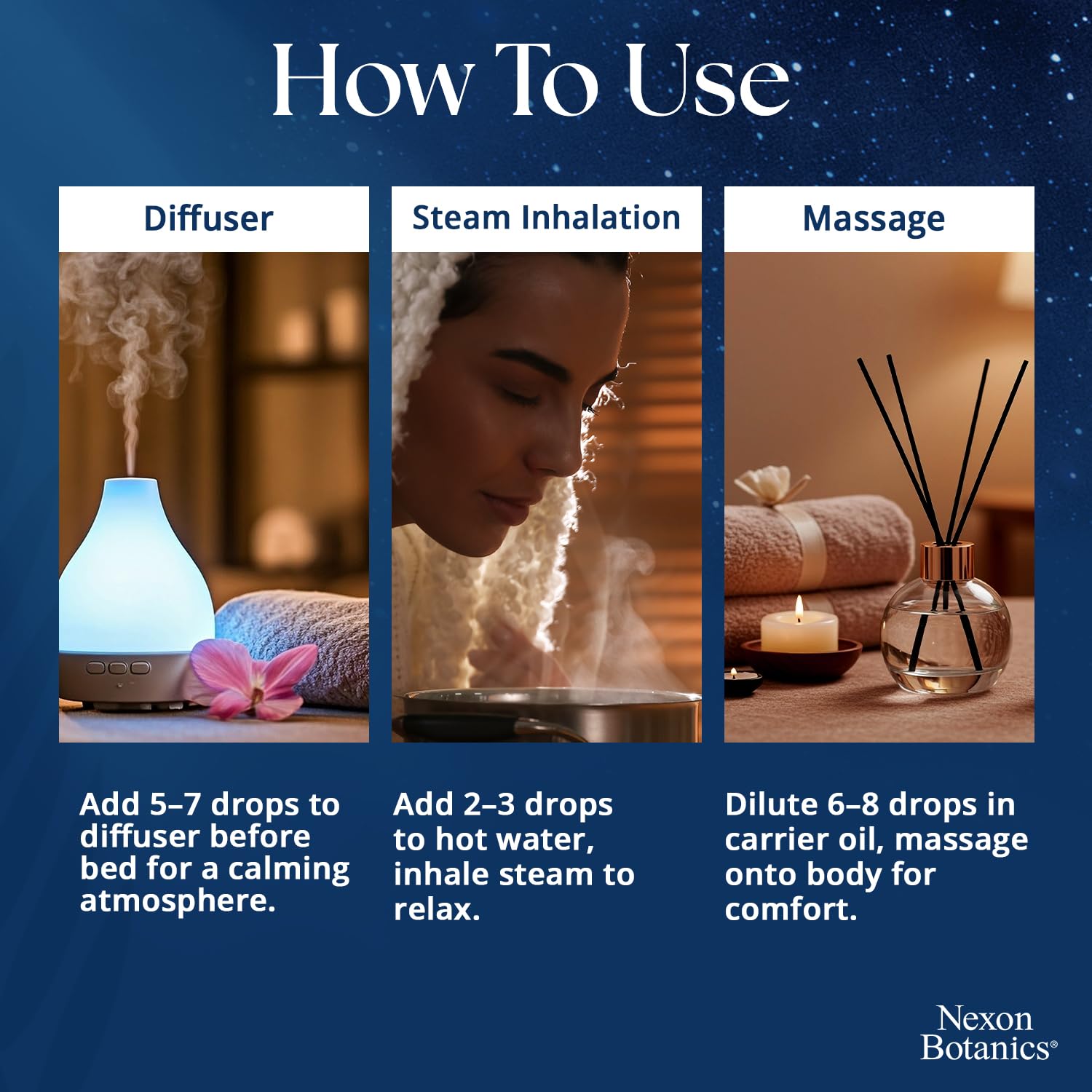 Aromatherapy: This sleep essential oil can be used for aromatherapy and relaxation; Use in a diffuser or humidifier to help encourage a calm environment; Adding essential oil for sleep to the bath is a great way to unwind before bed.