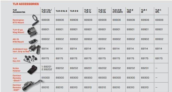Compatible with TLR-1 HL, TLR-1/TLR-1s, TLR-1 IR ; TLR-2 HL, TLR-2 HL-G, TLR-2 G, TLR-2/TLR-2s, TLR-2 IR Eye Safe, and TLR-2 IRW