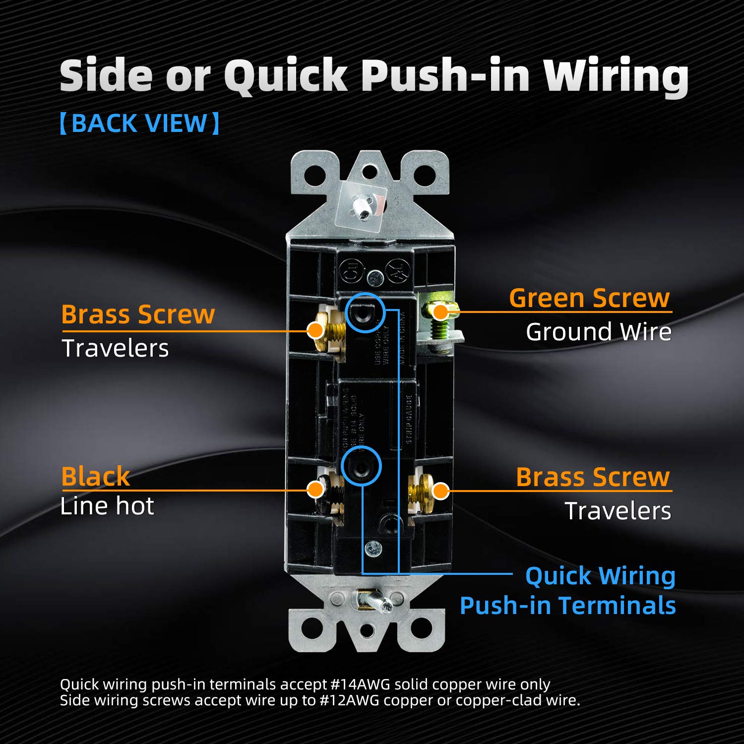 ✅【Easy Installation】Provide both quick push-in wiring and side wiring. Quick wiring push-in terminals accept #14AWG solid copper wire only. Side wiring terminal screws accept wire up to #12AWG copper or copper-clad wire. Break-off plaster ear for best flush alignment. Shallow body design fits standard junction boxes.