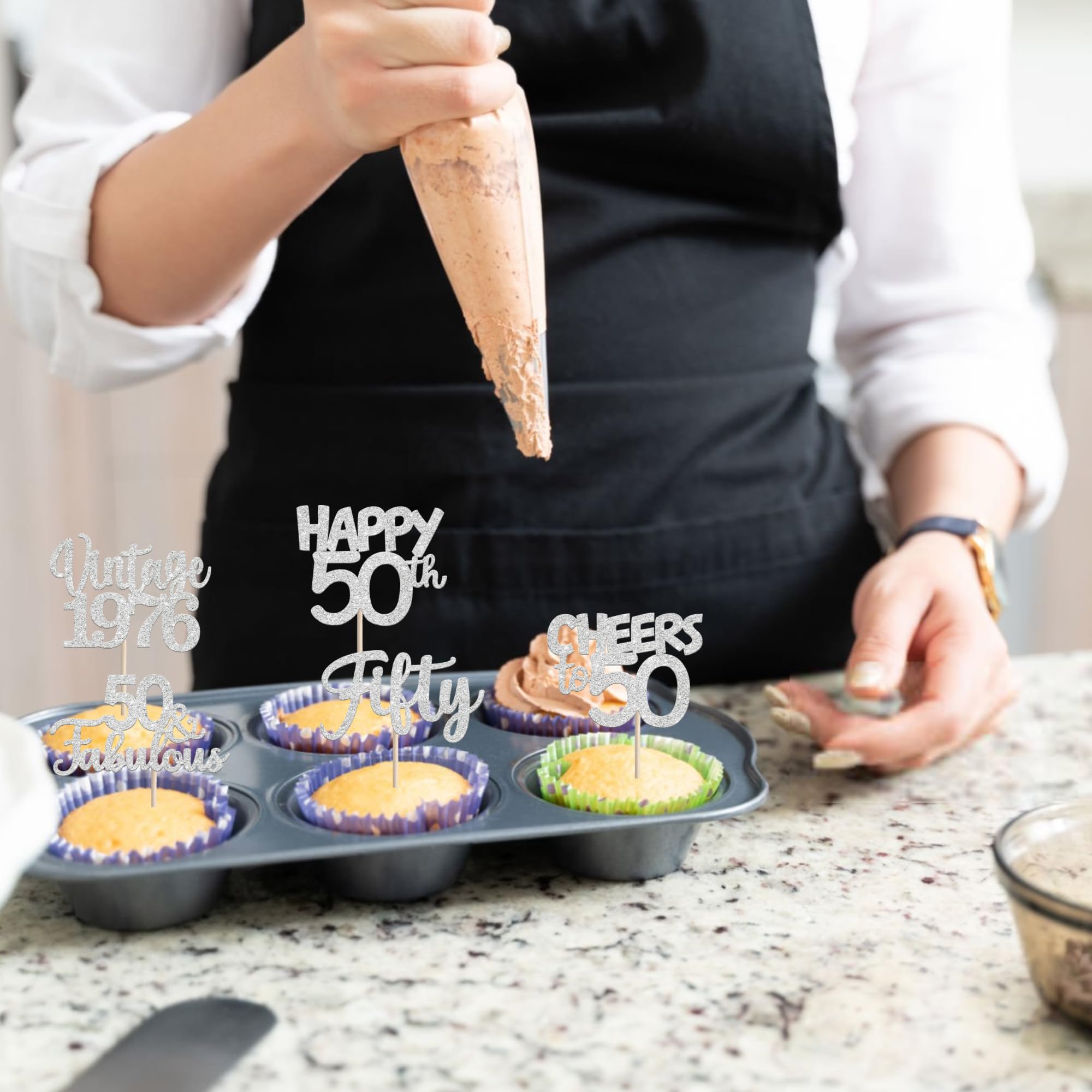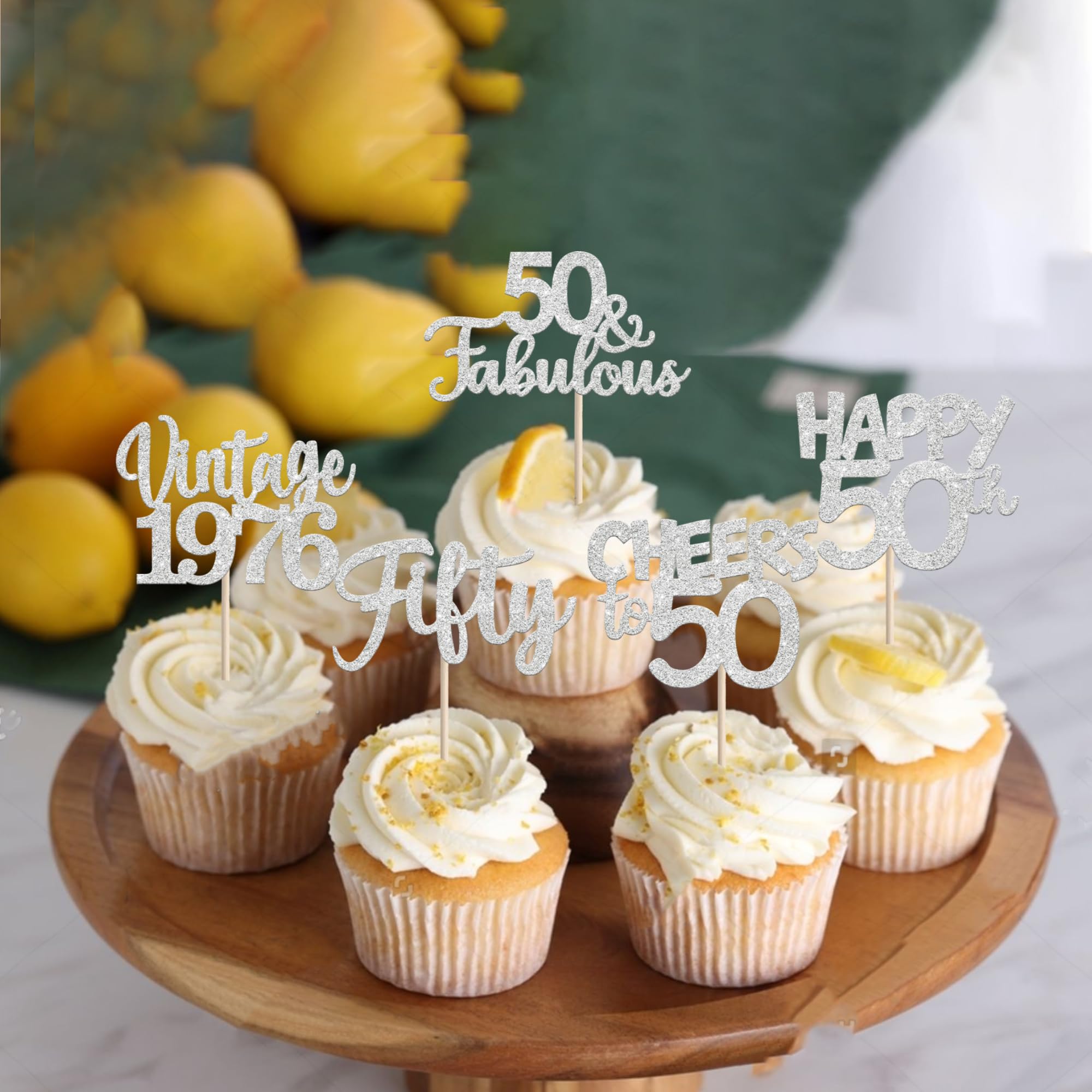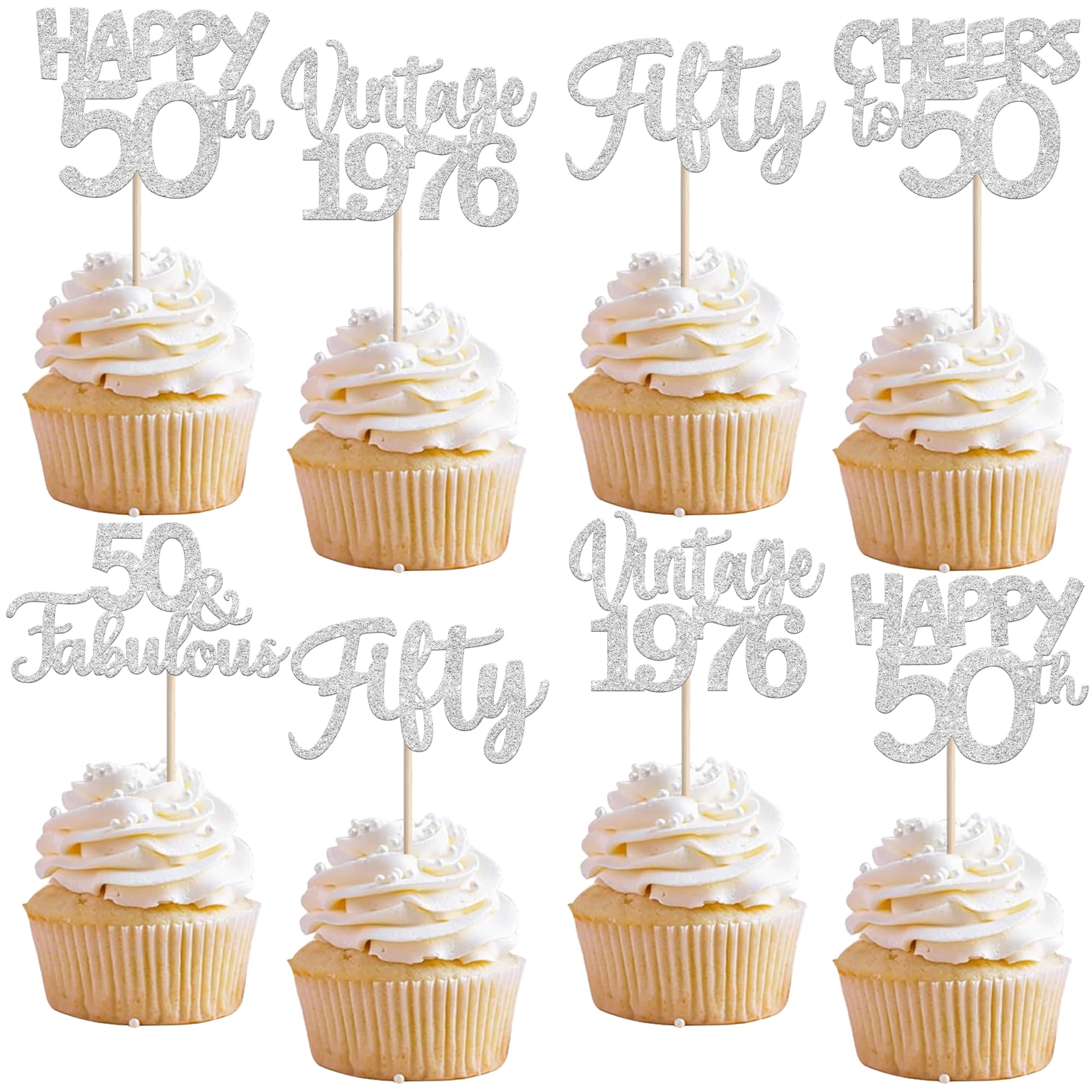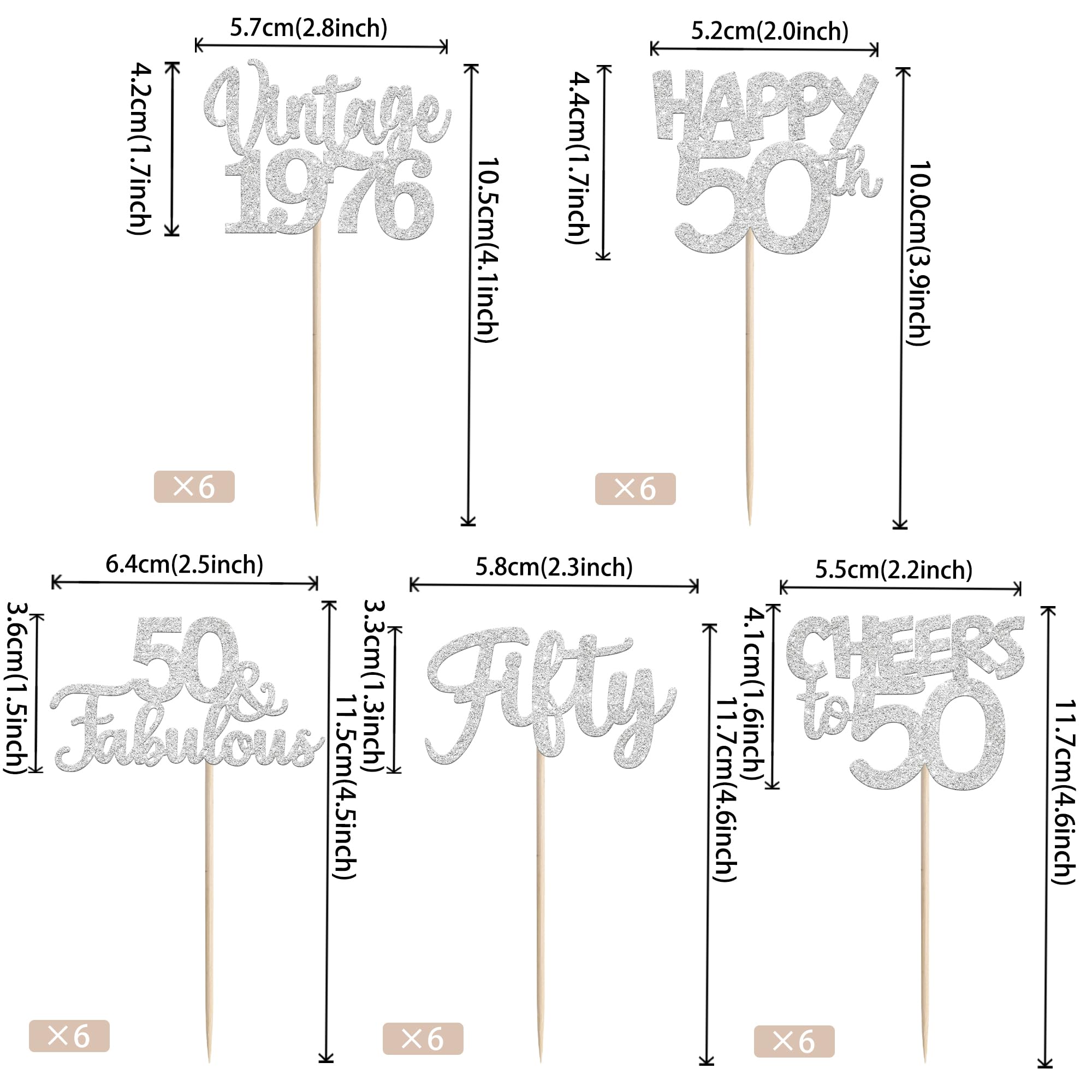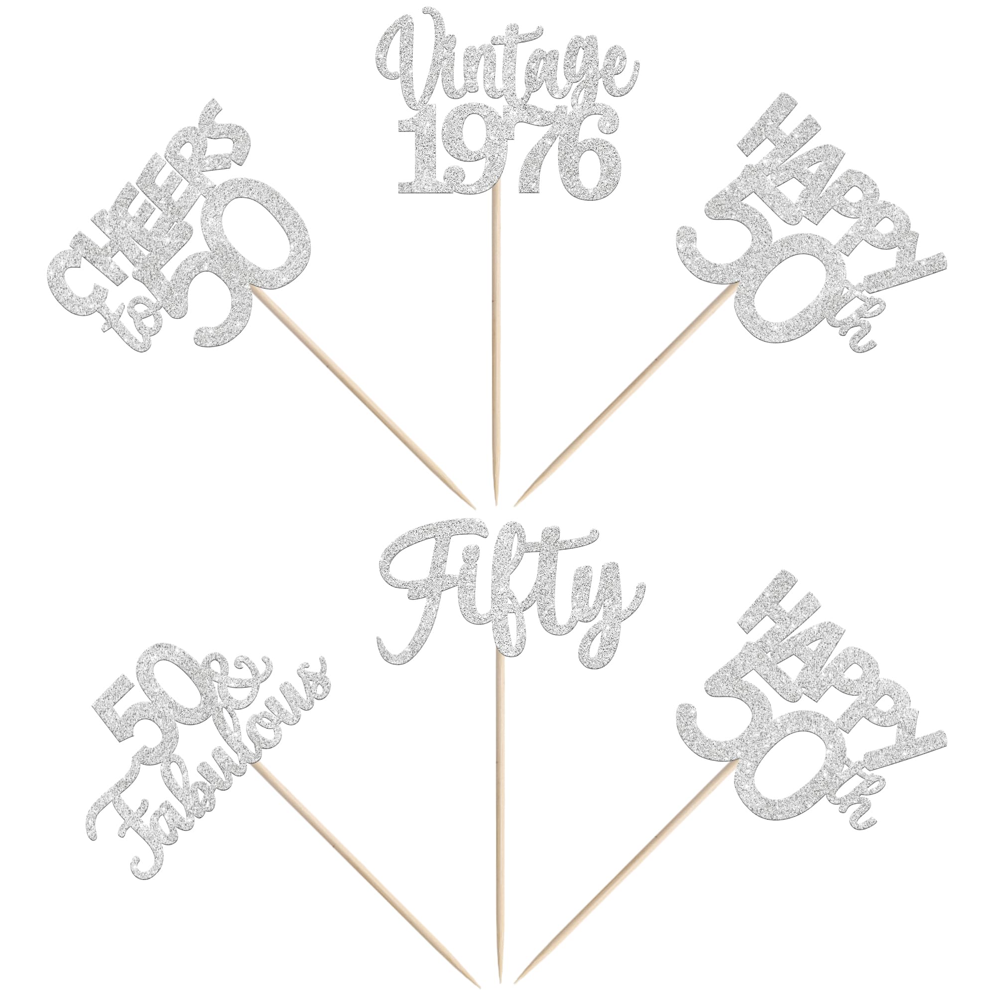 Cheers to 50 Fabulous Fifty Vintage 1976 Cupcake Toppers for Happy 50th Birthday Wedding Anniversary Party Cake Decorations Supplies Perfect for vintage 1976 theme party, 50th birthday theme party, 50th wedding anniversary theme party, cheers to 50 years theme party cupcake decorations supplies. Pack of 30 pcs,6 pcs of each design. The size is 2.2*4.3/ 2.5*4.3/ 2.1*4.3/ 2.3*4.1/ 2.2*4.3 inch ( with stick ) Made of high quality paper card stock,thick and sturdy. These cupcake toppers are single glitter, the back is white, and they are intended for decoration only, please do not put them in oven or microwave. If the item you received has any defects, please contact us immediately.we will deal with it within 24 hours.