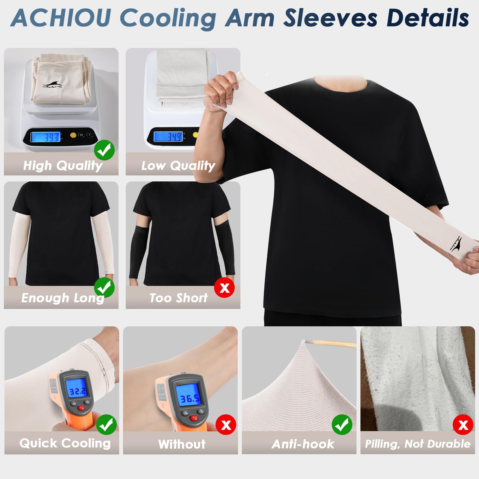 💪Ice Silk & Cooling Sleeve——Achiou arm sleeves for women are made of premium and cooling ice silk. It is smooth, cool and anti-uv because it has better hygroscopicity and breathability than ordinary materials. Performs well in cooling your arms quickly even if you’re doing exercises