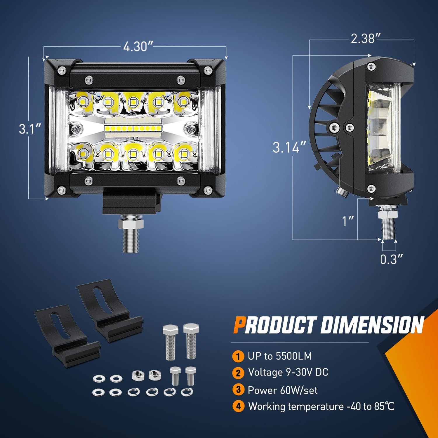 Super Bright Brightness: 60W pod lights, combination of 30 pcs superior-quality chips emit 5800-6000k bright white light, higher light transmission rate polycarbonate lenses - reduce optical loss, delivering 5500 lumens and ensuring that objects far clearly visible to prevent potential threats, offering you an unparalleled driving experience