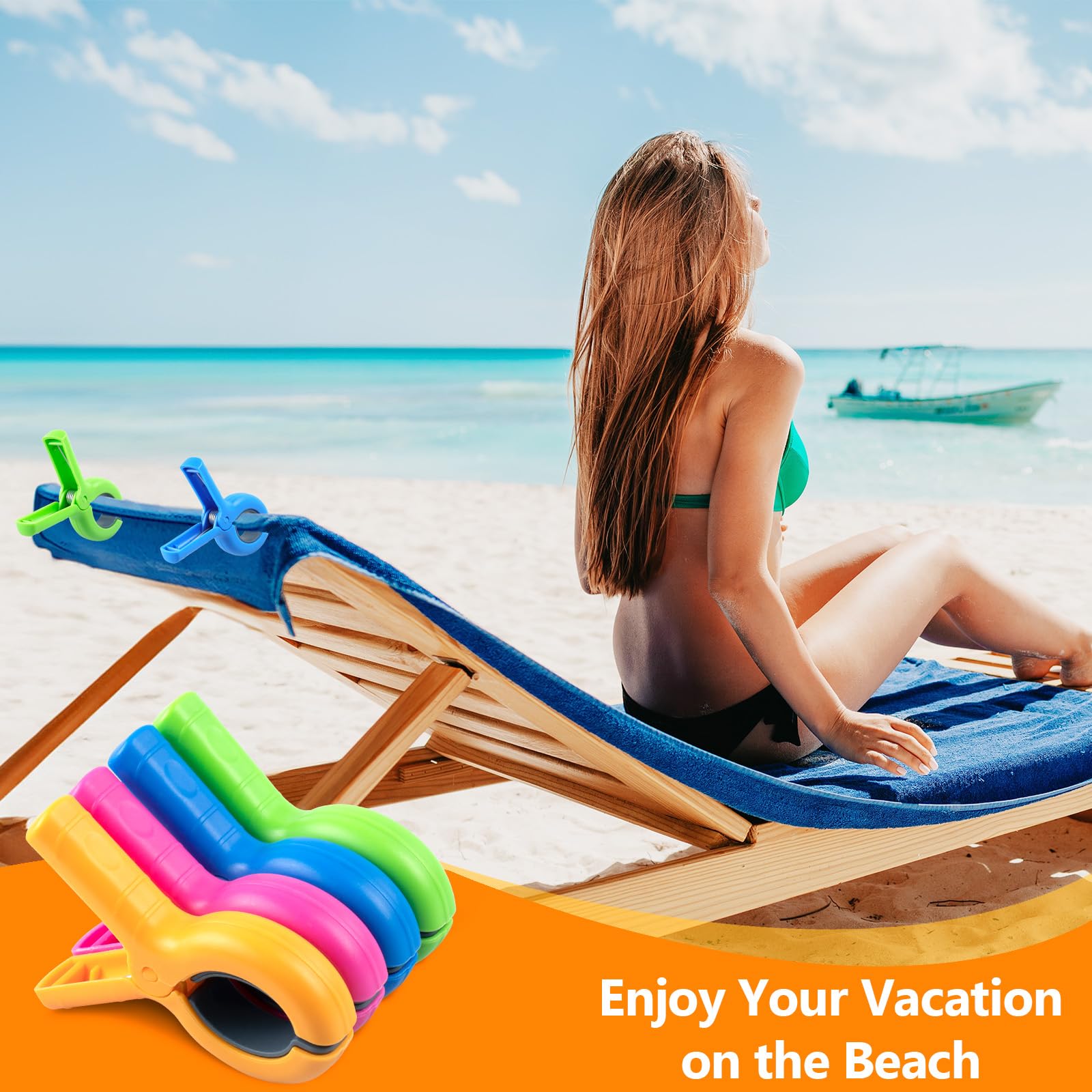 You will get: 8 pcs utility cruise essentials 2026 beach towel clip, 4 Colors ( yellow, blue, green, red ), bright and vivid colors of the pool chair towel clip so you can quickly find their beach chairs.