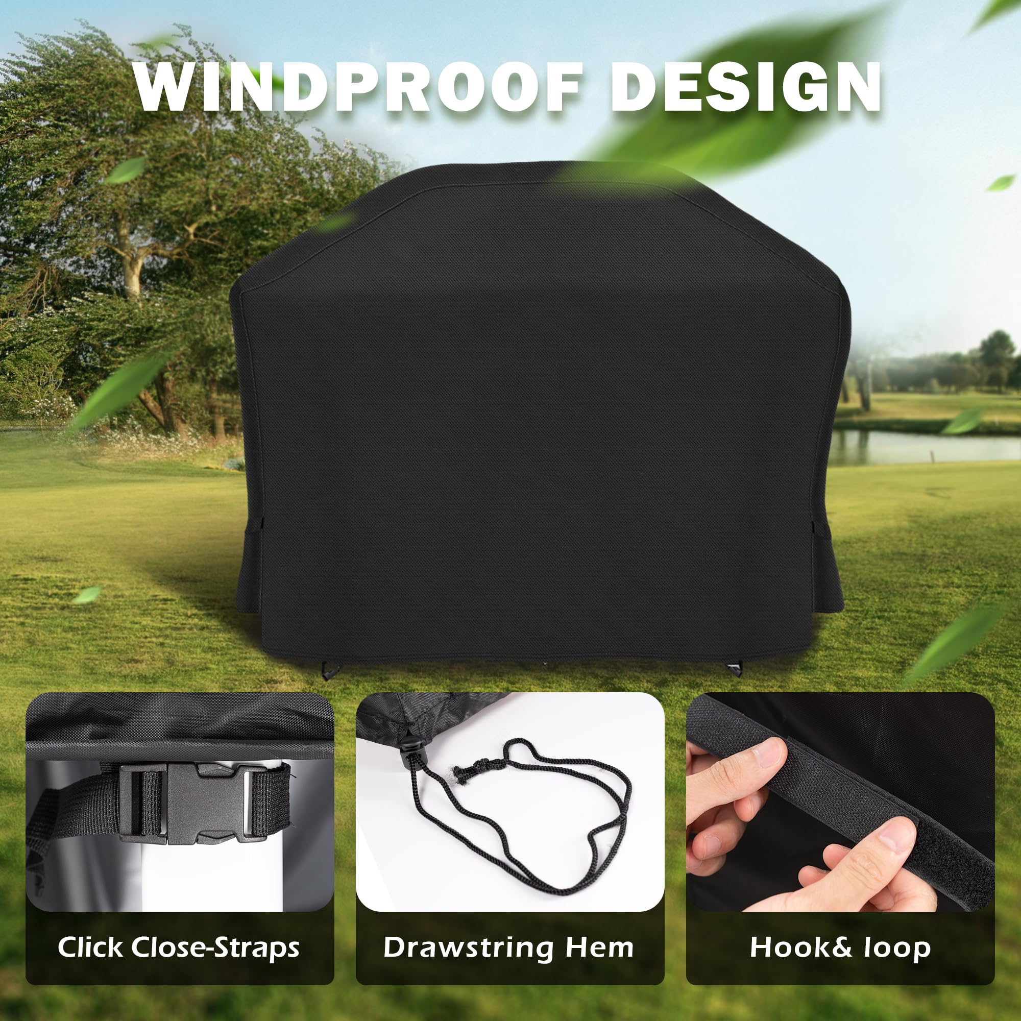FIT & SECURE – Drawstring and click close-straps allow you to easily adjust the grill cover for a tight and custom-like fit. Four buckles can keep the cover in place and prevent the cover from being blown off on windy days