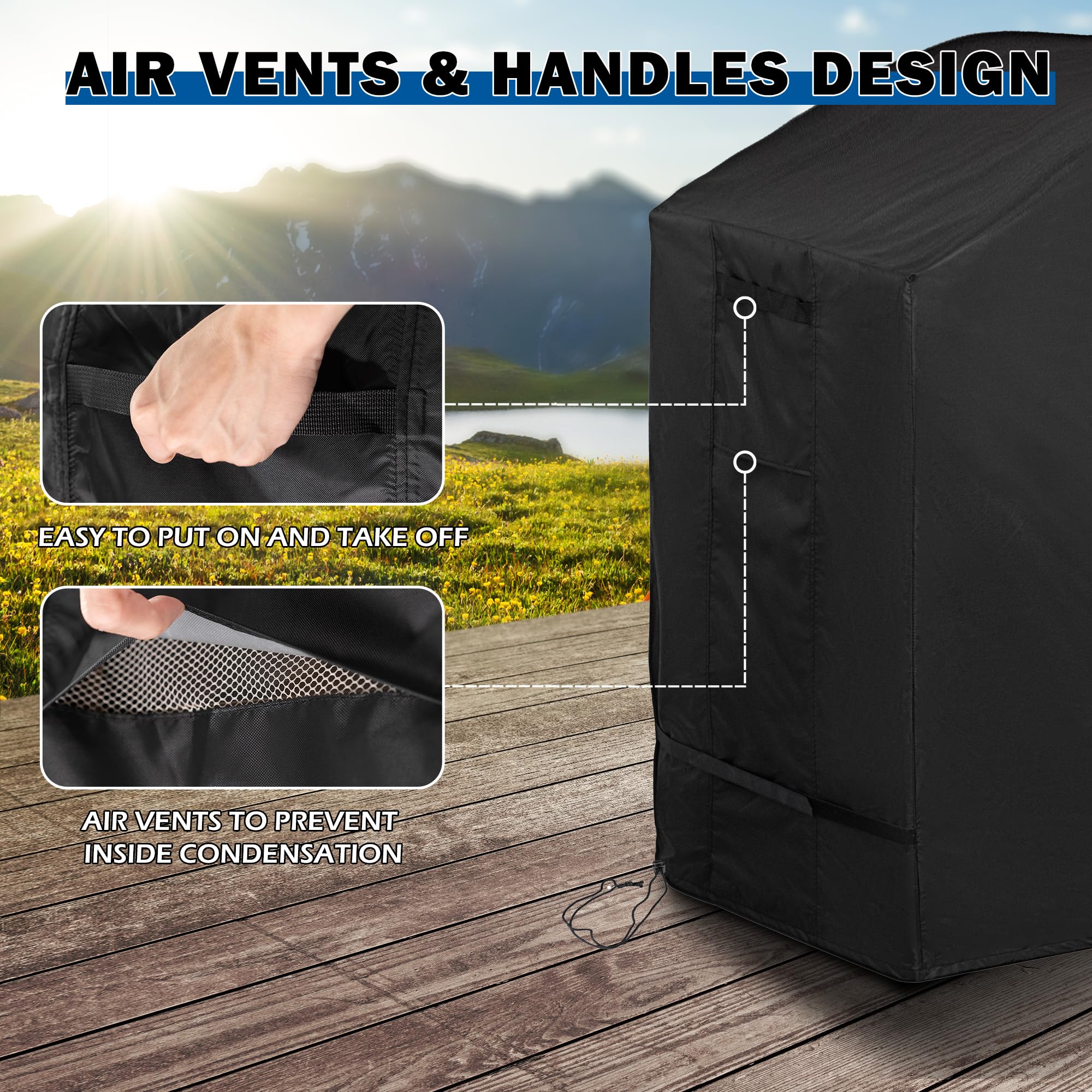 AIR VENT & HANDLES – The design of the air vents can improve the air flow to prevent inside condensation, keeping your outdoor grill dry and clean. Two reinforced handles make the grill cover easy to put on and take off
