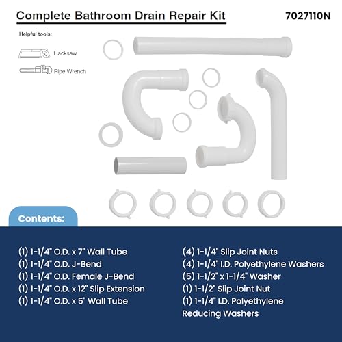 Product Description SINK PLUMBING SOLUTIONS FOR UNIVERSAL INSTALLATION Get all the plumbing parts you need to repair or re-install nearly any bathroom sink. Our PlumbCraft complete bathroom sink drain repair kit includes several replacement pipes and fittings to fit most sinks with drainage that connects to the wall or to the floor. You get enough pieces to accommodate a center or end drain setup. We offer a cost-effective solution for completing any sink plumbing task. Our bathroom sink drain assembly is a versatile and cost-effective option for making repairs to problem areas like J-bend and P-trap sink pipes and multiple installation options. All of our fittings are easy to install. Our bathroom sink plumbing kit comes with a detailed instruction sheet that removes the guesswork from any repair task or modification. There are also helpful graphics included that make all the plumbing parts easy to use for homeowners and pros. Use sturdy drain pipes to complete a solid job. Every piece of our bathroom sink repair kit is made of durable thermoplastic from the drainage pipes to the polyethylene washers. Get peace of mind working with reliable components that meet or exceed standards and predictably fit standard plumbing repair and installation practices. WE UNDERSTAND YOUR NEEDS At Plumbcraft we pride ourselves on getting to know our customers to fully understand their needs and we offer practical advice and cost-effective solutions to ensure your home is warm and cozy and your bathrooms are the perfect haven for a luxurious soak in the bath or an invigorating shower. Get your Plumbcraft Complete Kitchen Drain Repair Kit today for sturdy, reliable plumbing that you can count on. From the Manufacturer Complete bathroom drain repair kit. Easy to install. Universal installation. Install to wall or floor. 15 pieces for mulitple options: (1) 1 1/4 X 7 WALL TUBE, (1) 1 1/4 J-BEND, (4) 1 1/4 washers, (4) 1 1/4 nuts, (1) 1 1/2 X 1 1/4 washer. (1) 1 1/2 nut, (1) 1 1/4 x 12 extension tube, (1) 1 1/4 x 5 tube, (1) 1 1/4 female j-bend.