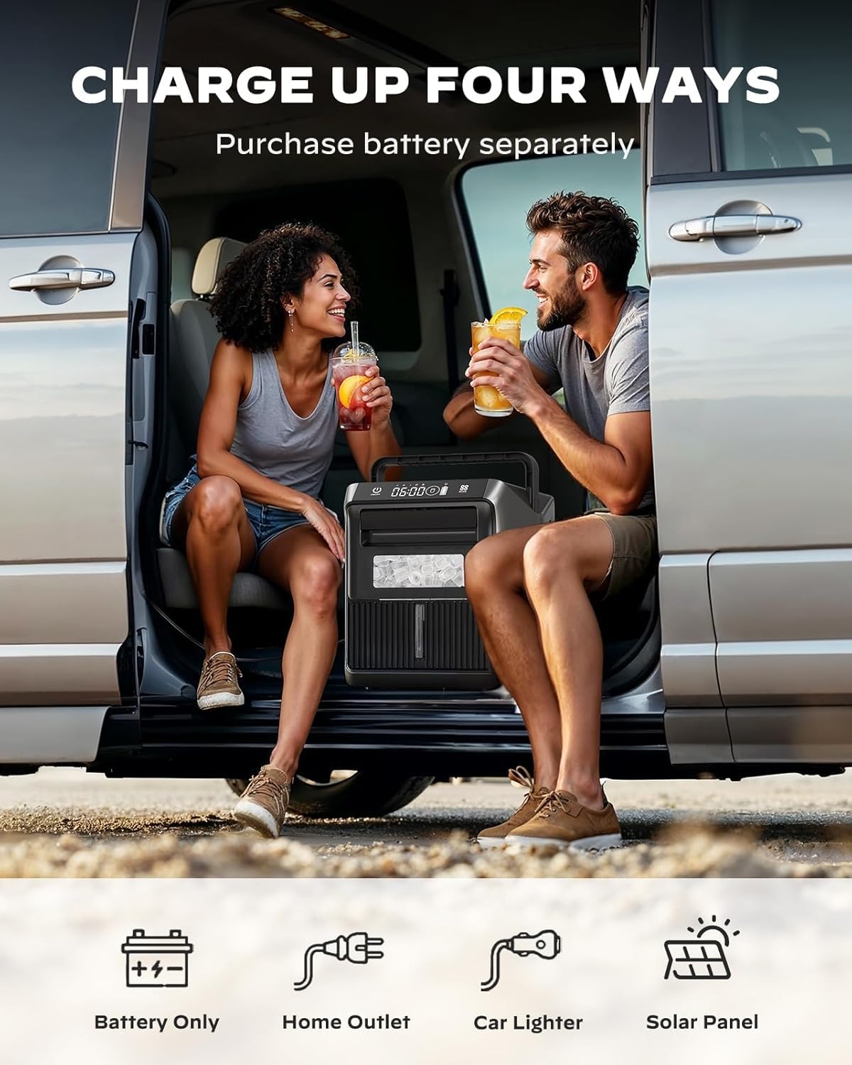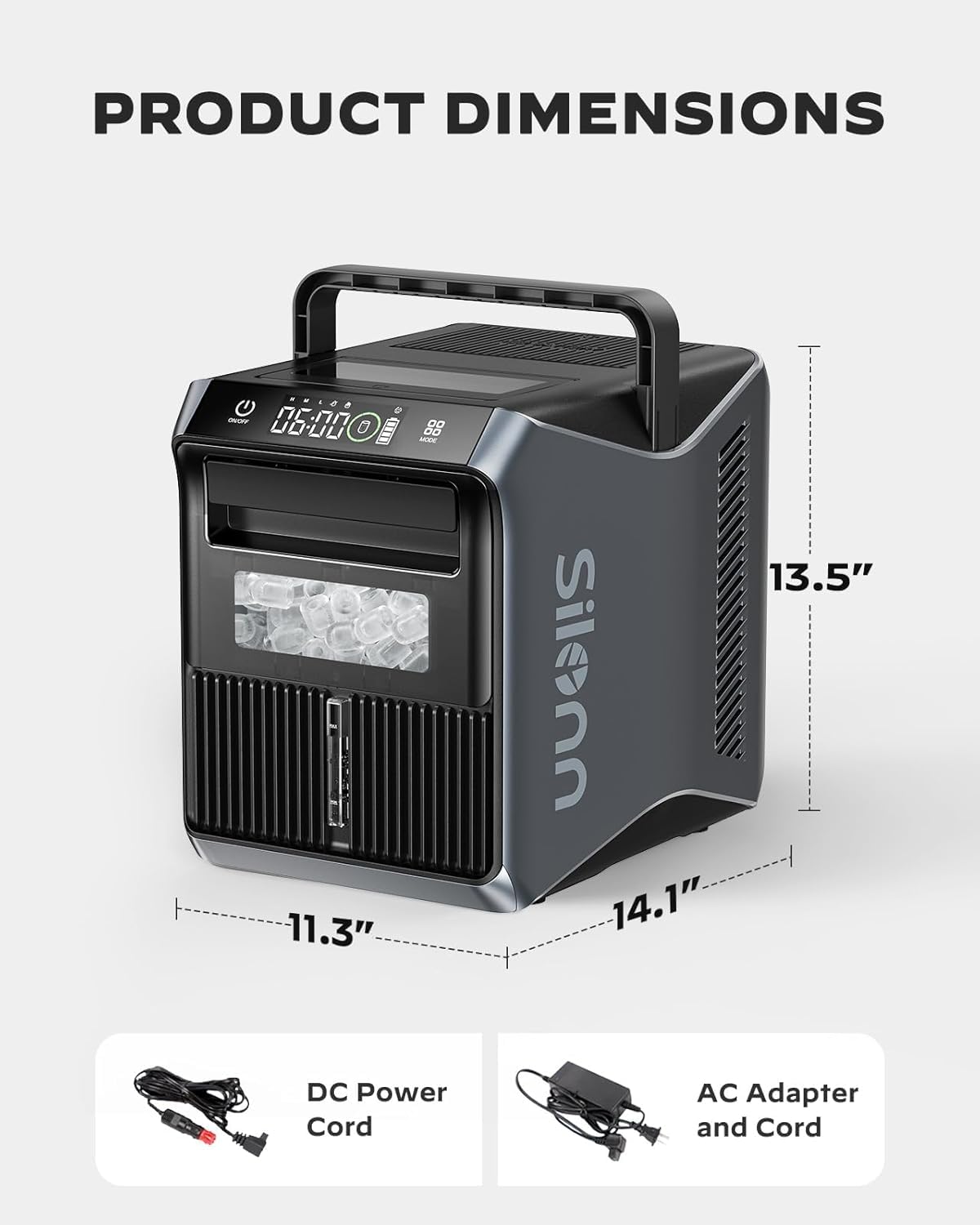 Ice Powered by Battery: Power your ice maker through four options - insert Silonn rechargeable battery, solar panel, car (12V/24V), or home power (100V-240V). Enjoy up to three hours of battery-powered ice-making with this portable ice machine – perfect for outdoor adventures