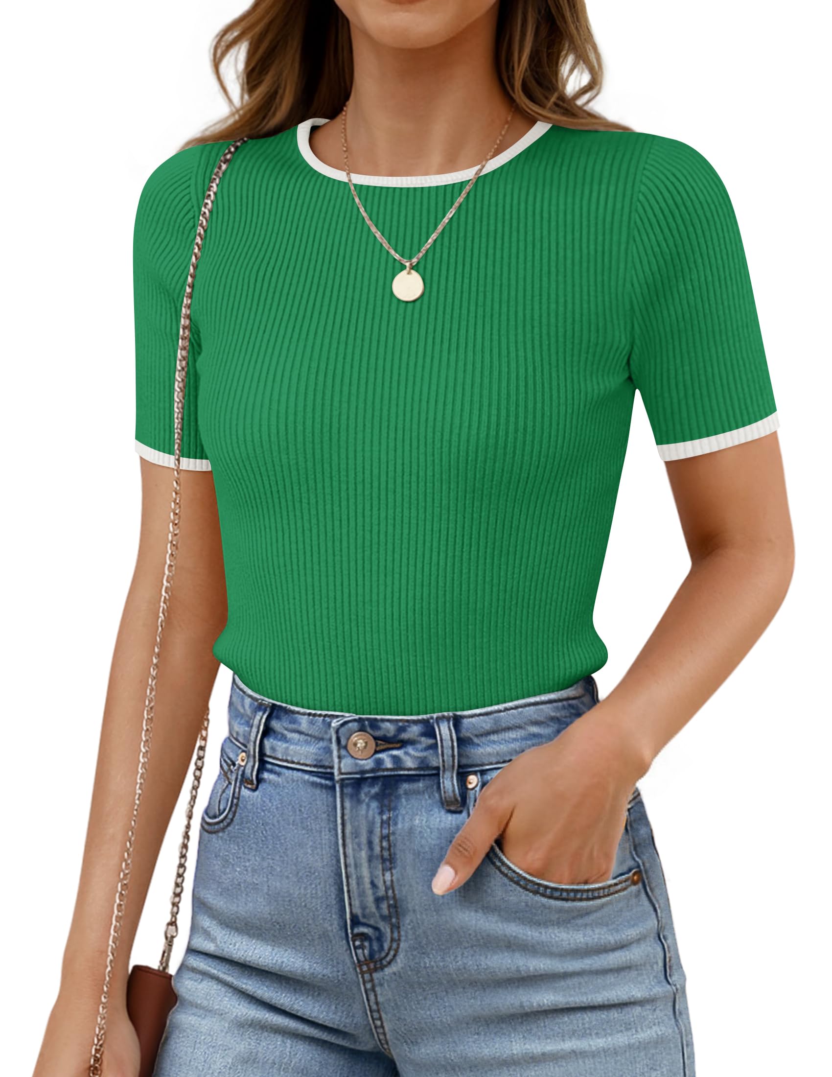 You can't go wrong wearing a basic tops! This summer clothes features a classic round neck, short sleeves, ribbed knit texture, slim fit, length above the hips, contrasting colors detailing along the neckline, cuffs, unique and simple style.