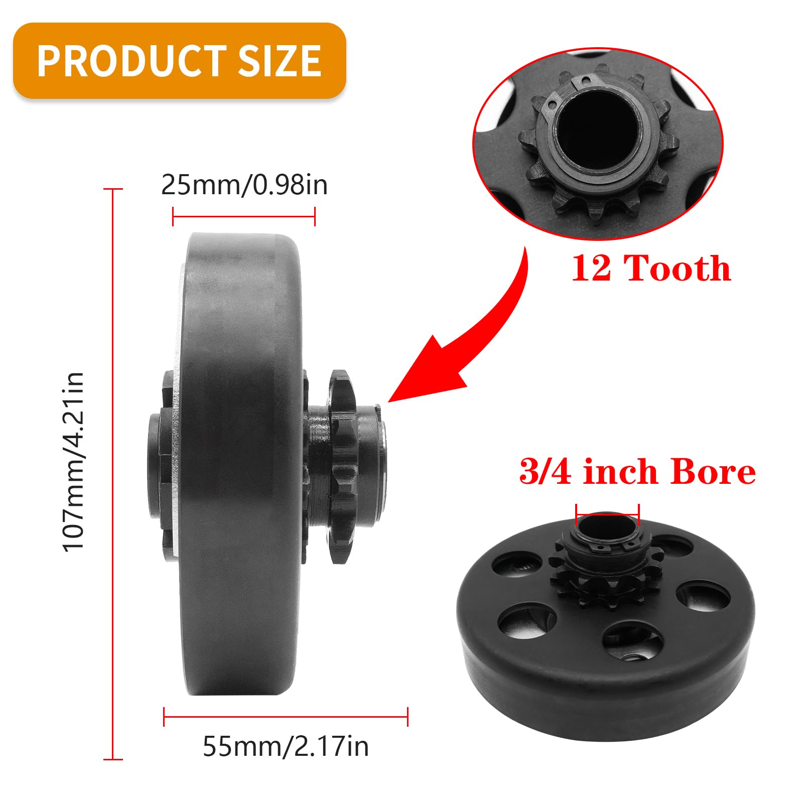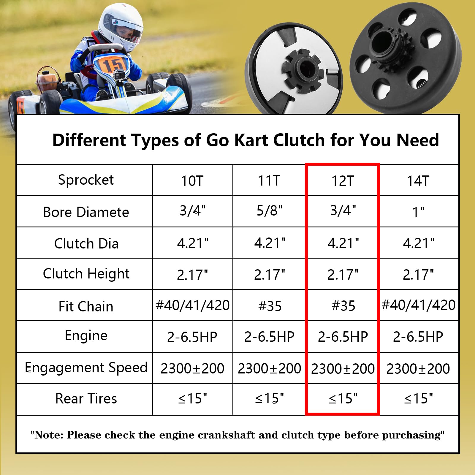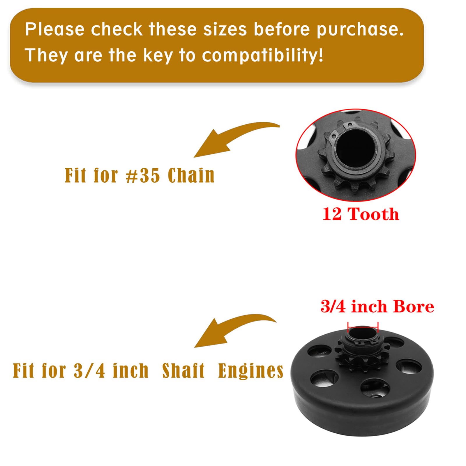 【3/4" Bore 12 Tooth Centrifugal Clutch】This go kart clutch 3/4" Bore 12T for #35 Chain, with 3/4" Bar Shaft and 3/16" Key. Widely applicable to Go Kart, minibike, generator, garden tractors, scooterx, sport kart, mini chopper, and mini motorcycles engines(Chain Not included).