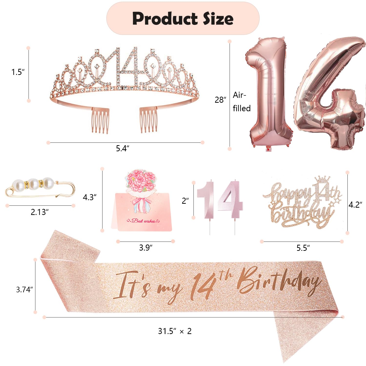 14th Birthday Decorations for Girls: Glittery 14th tiara/crown *1pc, “It’s my 14th birthday” sash *1pc, Happy 14th birthday cake topper *1pc, pearl pin*1pc, 1+4 numeral candles *1set, 1+4 numeral balloons *1set, they are exquisitely packaged in the carton.