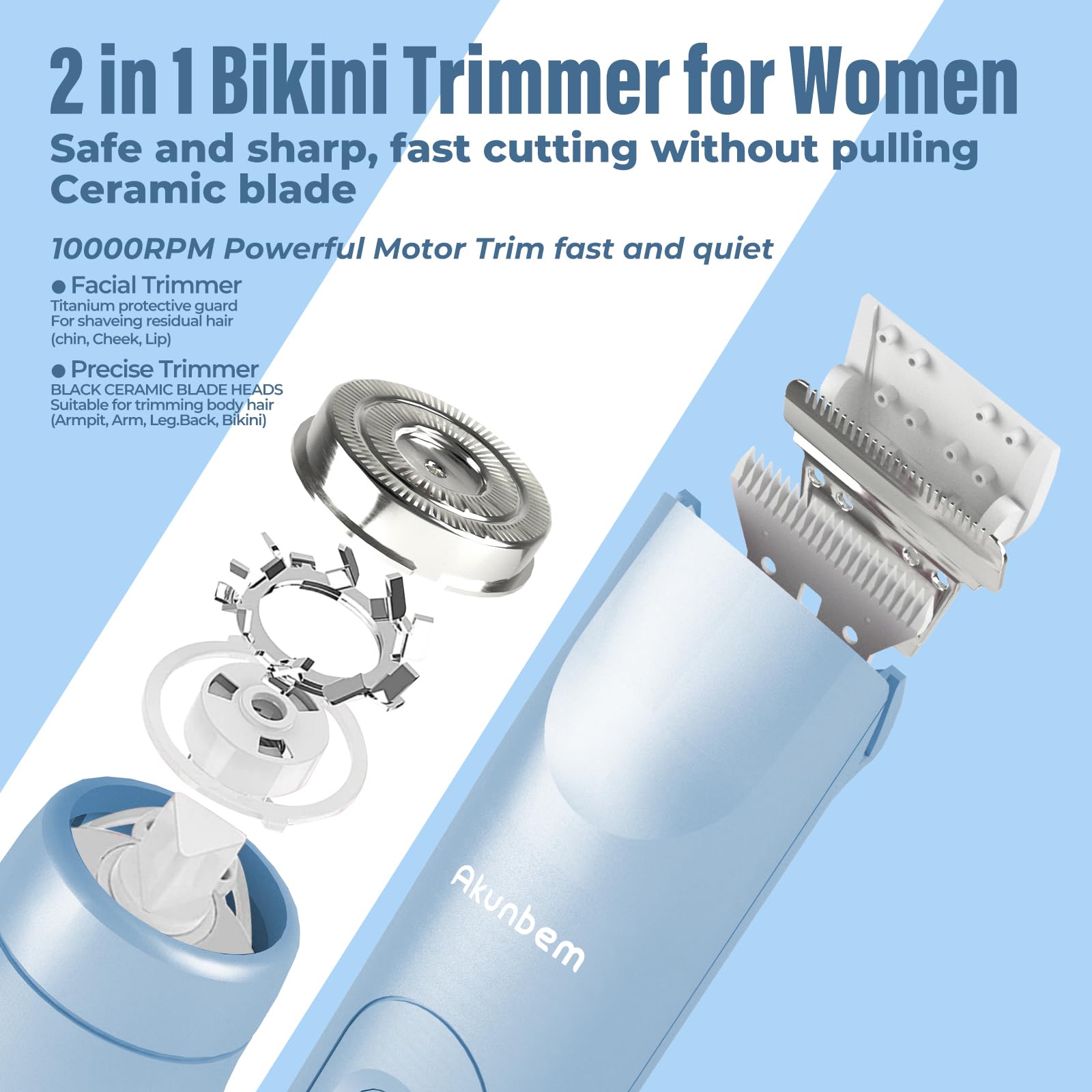 Versatile Grooming Kit: Akunbem women electric shaver features an innovative dual head design that combines the functions of a body and facial shaver in one. There is no need to change the cutter head frequently. It can accurately and smoothly remove hair from the face, body and sensitive areas.