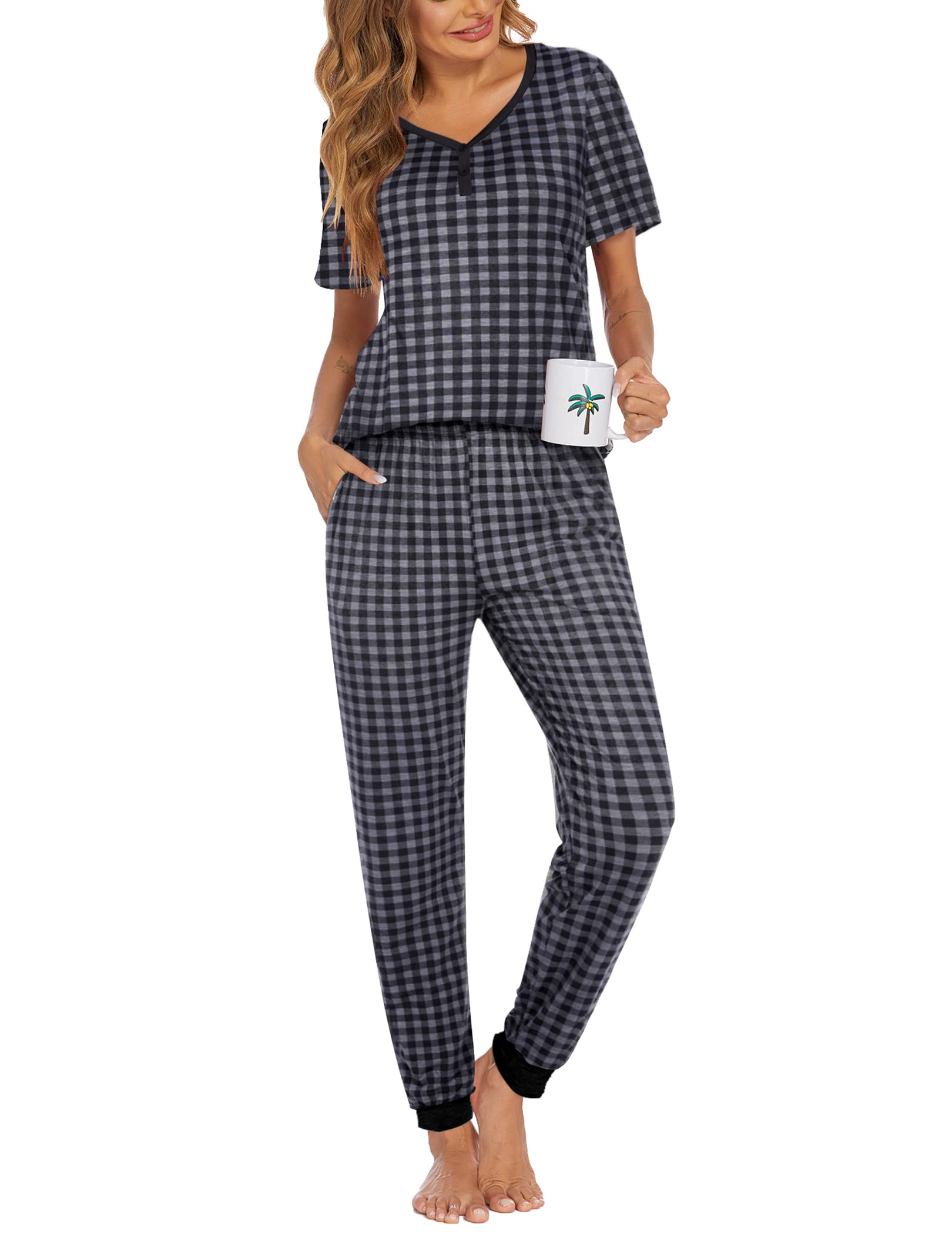 Short Sleeve Tops: The sleepwear pj features with v-neck and button tops. Simple pullover styling for easy fit. Stylish and elegant ladies sleepwear night set