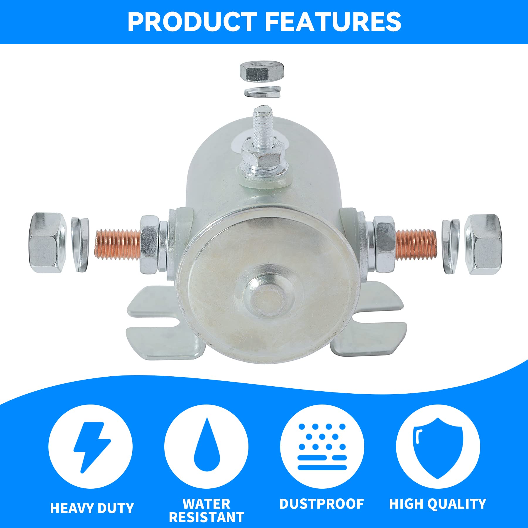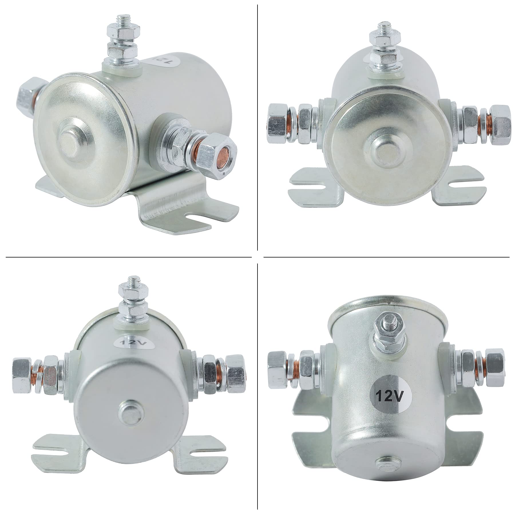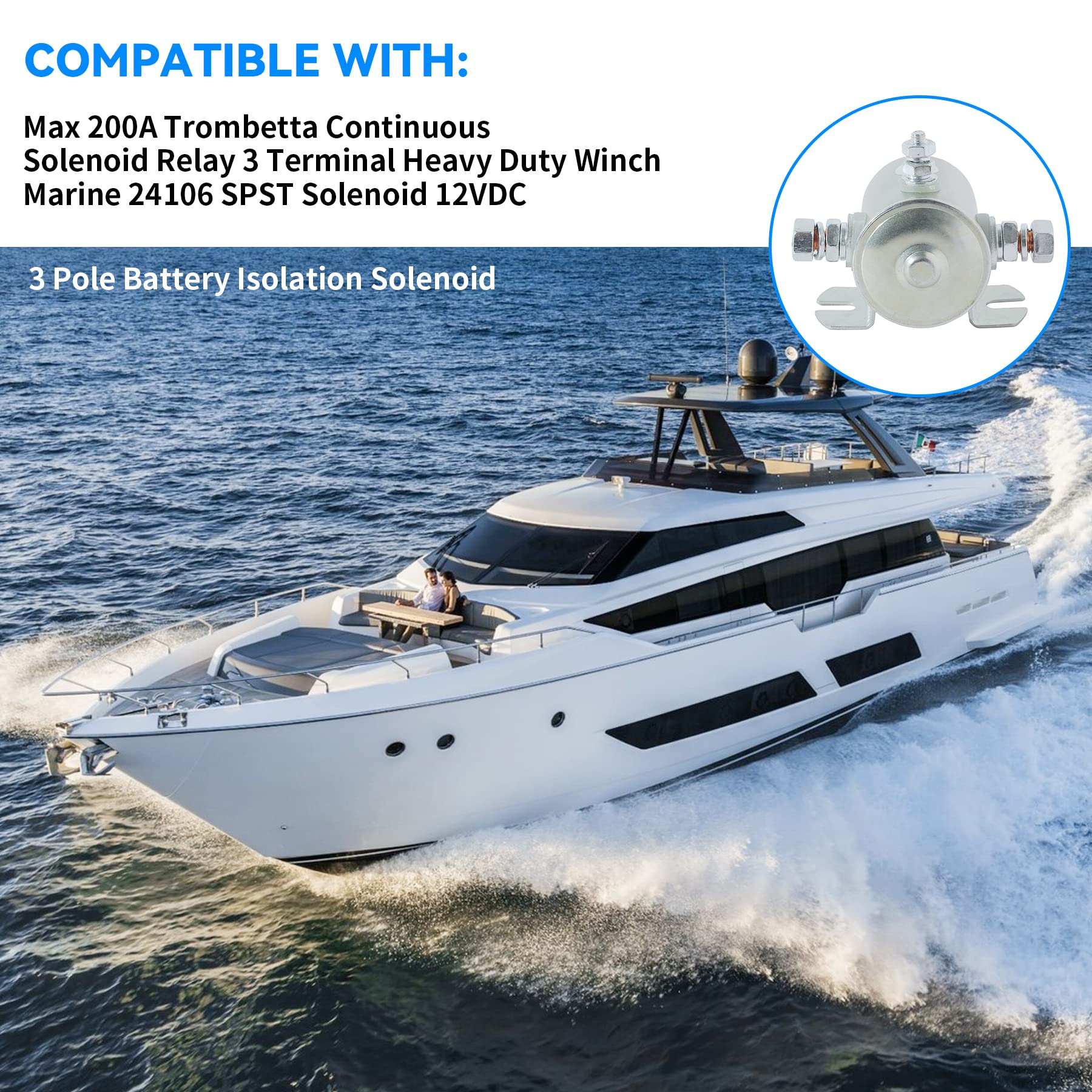 Stylemafia Max 200A Trombetta Continuous Solenoid Relay 3 Terminal Heavy Duty Winch Marine 24106 SPST Solenoid 12VDC Contacts:Normally Open (NO)/ Flat Base Metal Case / 10-32 Terminal 3 Pole Battery Isolation Solenoid, 12VDC With 2 Copper Point,Housing plated Steel Case / 180Flat mounting bracket./ Mounting holes: 5/16 x 19/32, 2-13/64 on centers. Our Coil Roll is using 180℃ Copper. Max Current Above 200amp/ Rate Current: 100A / Our Cover is Environmental Plating,Sealed Unit Protects Solenoid From The Elements Helping Prevent Corrosion INSTIALL:One side goes to Battery, opposite side to starter, top screw which is smaller goes to switch or key start only. It is already grounded internal. Note:If it is the energizing circuit which is typically 16/18 Awg , suggest a 5amp fuse;If 10 Awg wire suggest 30 amp auto cicuit breaker; If high output alternator, suggest an 8 Awg wire with a 50 Amp auto circuit breaker