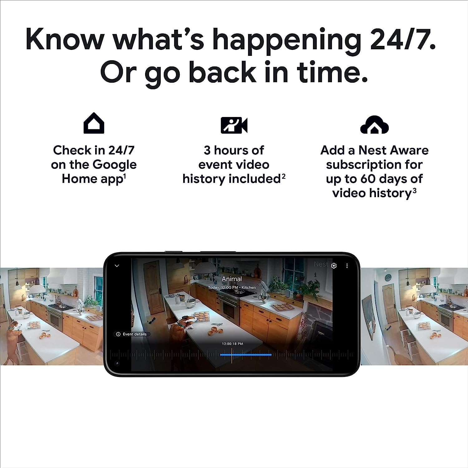 Easily check in from anywhere 24/7 with 1080p HDR video[1] with night vision, and see what you missed with 3 hours of free event video history[2]; add a Nest Aware subscription (sold separately) for up to 60 days of video history[3]