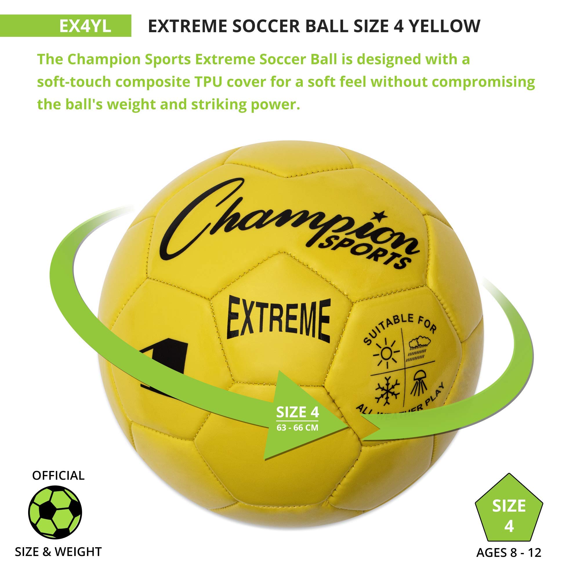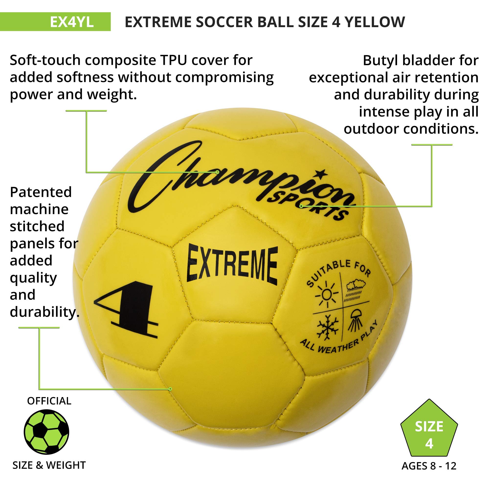 The Champion Sports Extreme Soccer Ball is a Durable, All-Weather Ball for Competition & Training. Built for both competitive matches and casual play, the Champion Sports Extreme Soccer Ball is designed to perform in any weather. Its soft-touch TPU cover provides a comfortable feel for dribbling, passing, and striking, while maintaining the weight and power needed for accurate shots. Engineered for durability, this high-quality soccer ball features a butyl bladder for superior air retention and machine-stitched panels for long-lasting performance. Whether you're playing in the heat, cold, wind, or rain, this ball maintains its shape and reliability. Available in three sizes: EX3 (Size 3): Ages 8 & under, EX4 (Size 4): Ages 8 to 12, and EX5 (Size 5 – Official Size): Ages 12 & up. Choose from a variety of vibrant colors, including Red, Orange, Yellow, Green, Blue, Purple, Black, Silver, and Pink. Note: Ball ships deflated. Pump sold separately.
