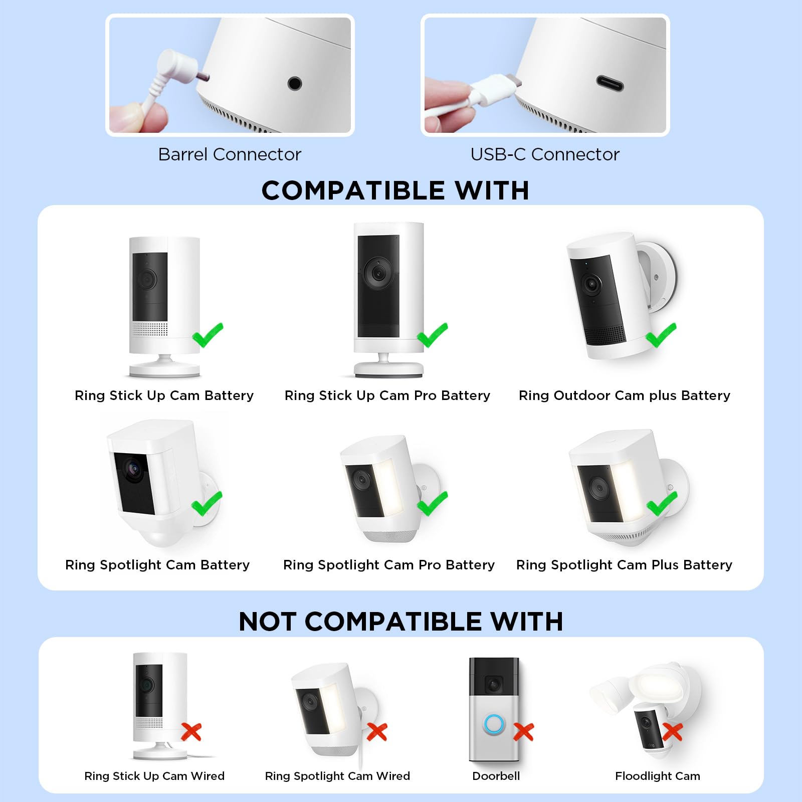 【Designed for Ring Battery Cameras】This Ring solar panel is built specifically for Ring battery-powered cameras, including Stick Up Cam Battery/Pro, Outdoor Cam Plus and Spotlight Cam Battery/Plus/Pro. Not compatible with Doorbell, Floodlight, Wired or Plug-in Ring models.