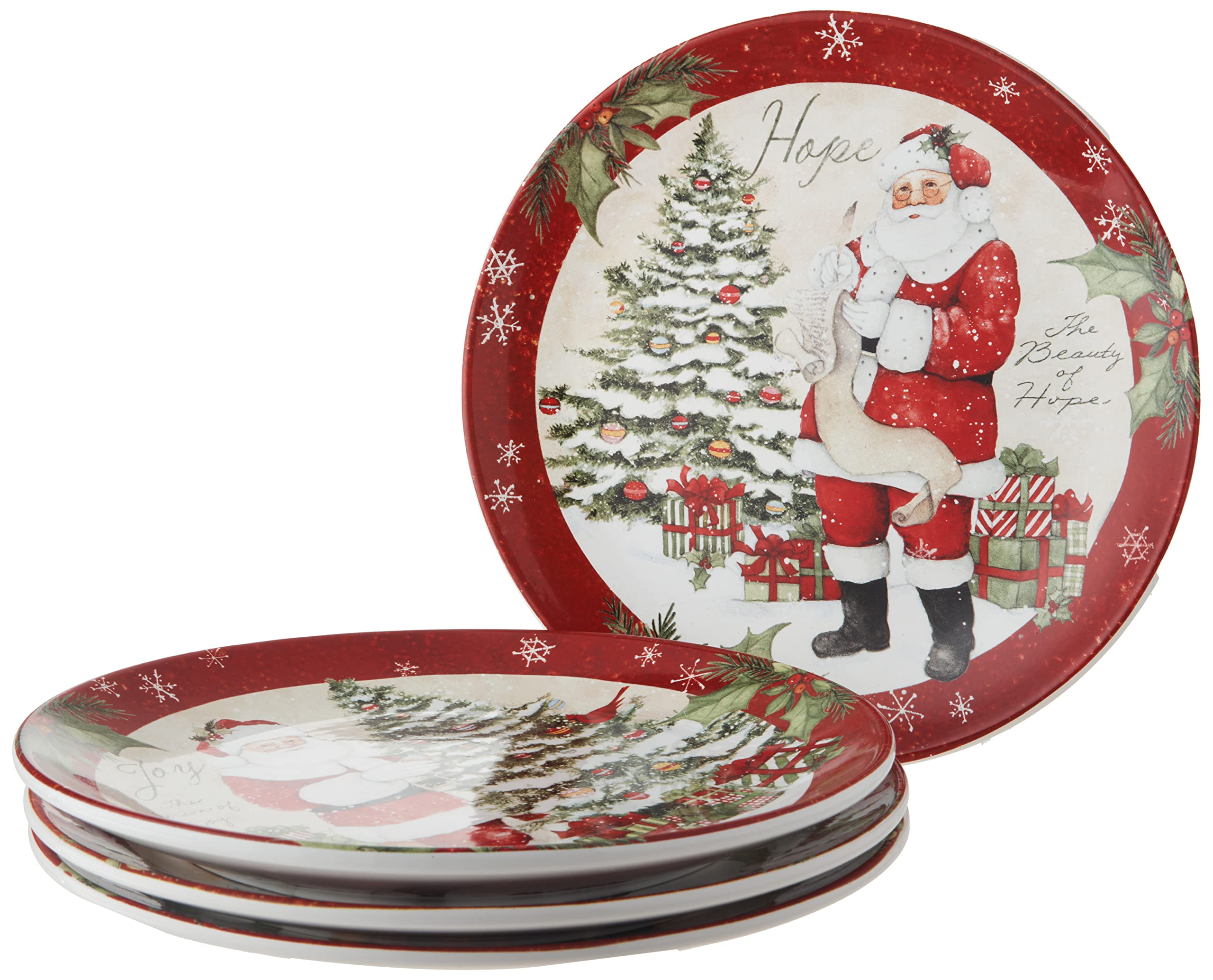 Add vintage charm to your holiday table with the Holiday Wishes Christmas Salad Plates Set of 4. Each 9-inch ceramic plate features a different Santa Claus illustration paired with classic holiday messagesPeace, Love, Joy, and Hope. These nostalgic designs bring warmth and cheer to any meal, perfect for festive entertaining or cozy family dinners. Elevate your holiday decor with timeless art that celebrates the spirit of the season.