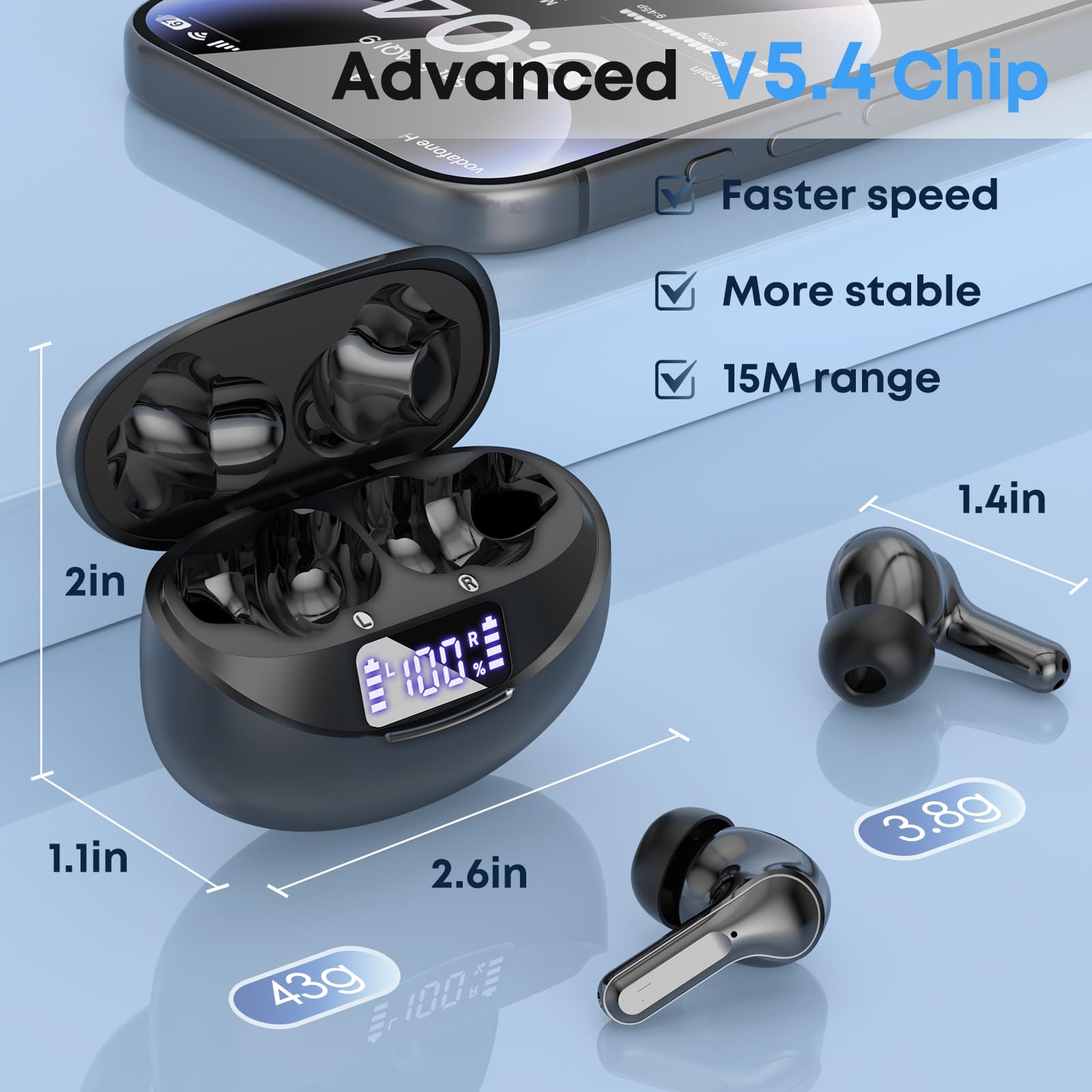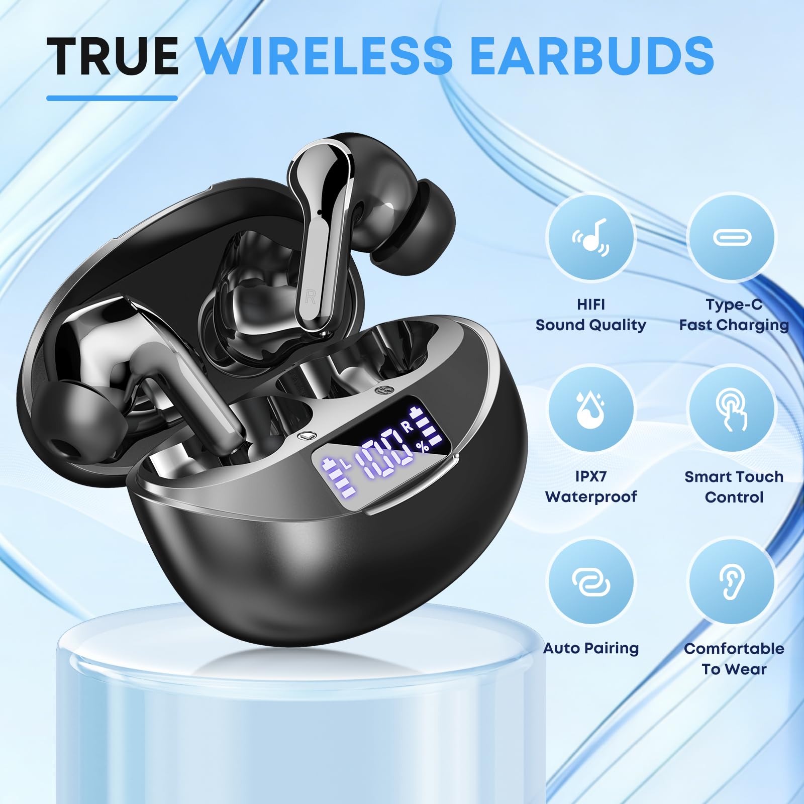 【LED Power Display & Extended Battery Life】 The smart LED digital display provides clear, real-time visibility into your precise battery status at a glance. The high-capacity charging case supports Type-C fast charging, offering multiple full recharges for the earbuds. Enjoy up to 7-8 hours of continuous playback on a single charge, and a remarkable total battery life of up to 50 hours with the charging case—easily covering days of typical use without needing a power outlet.