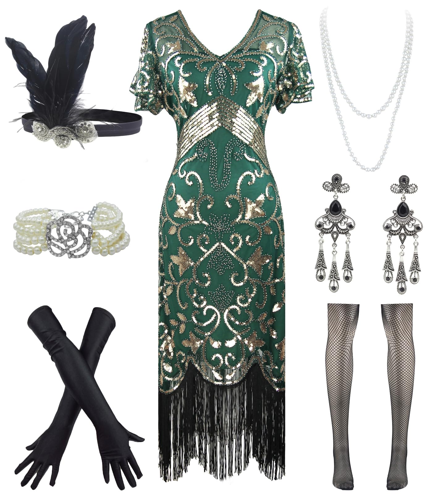 Package:1 x Sequin Dress, 1 x Cigarette Holder, 1 x Long Satin Glove, 1 x Feather Headband, 1 x Pearl Necklace, 1 x Earring, 1 x Pearl Bracelet, 1 x Fishnet stockings