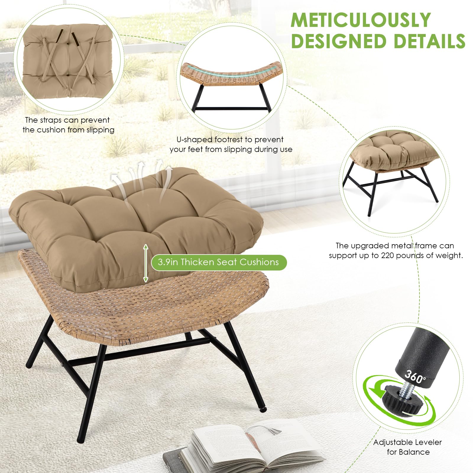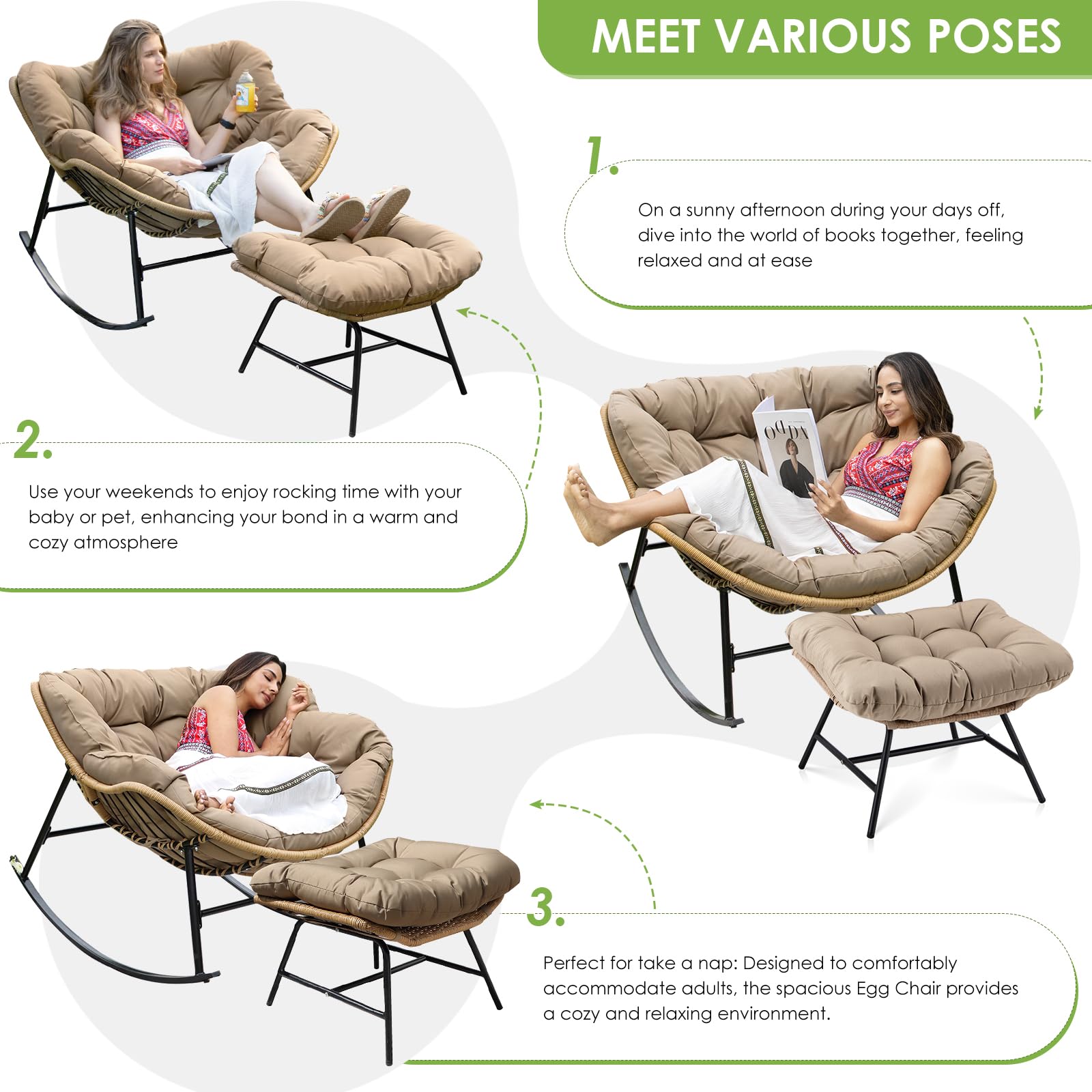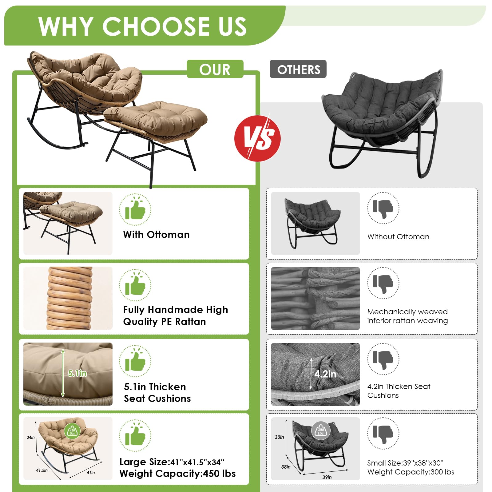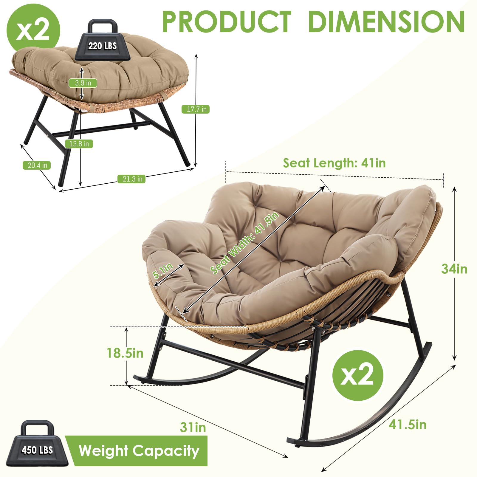Heavy Duty Stability: Built with a reinforced alloy steel frame and treated with e-coating for superior resistance to outdoor elements, this large rocking papasan chair supports up to 450 lbs; the engineered base creates a smooth 30-degree rocking motion, combining the sturdiness of steel with the soothing glide of ergonomic design; compared with lightweight chairs, this structure feels stable and secure, ensuring years of reliable use on patios, decks, or indoor spaces without wobbling