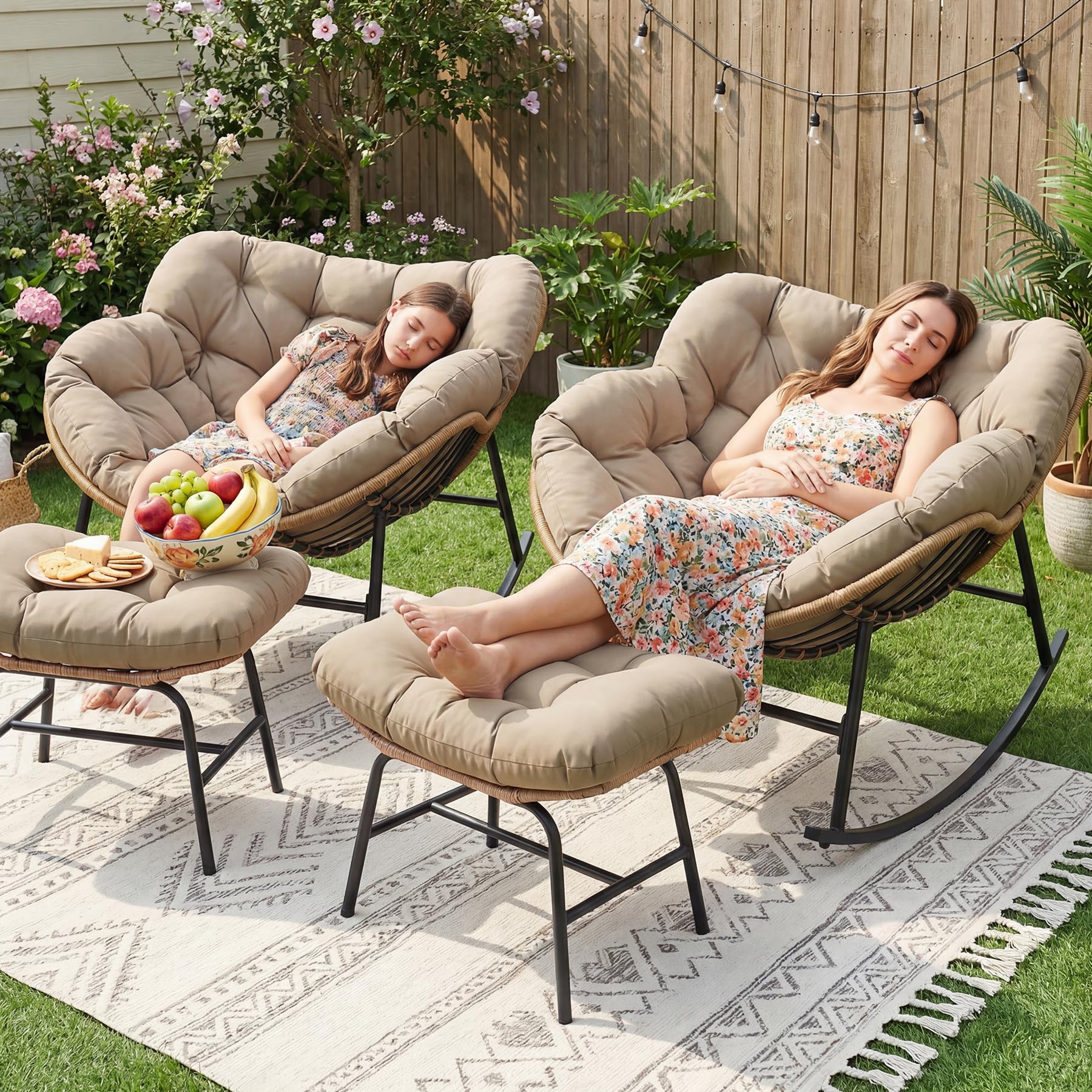 All-Weather Support: Sun, rain, or shifting humidity—this outdoor papasan rocking chair is built to handle it all; the powder-coated steel frame and handwoven PE rattan stand strong against outdoor conditions without rusting or fading; cushions are wrapped in solution-dyed polyester that resists color loss after extended sun exposure and repels light splashes from morning dew or unexpected drizzle; from the patio to the balcony, porch, or sunroom, it keeps its look and comfort season after season with minimal upkeep