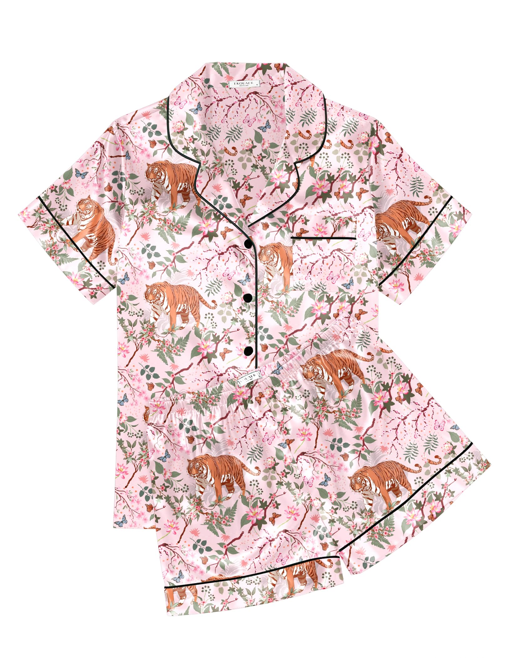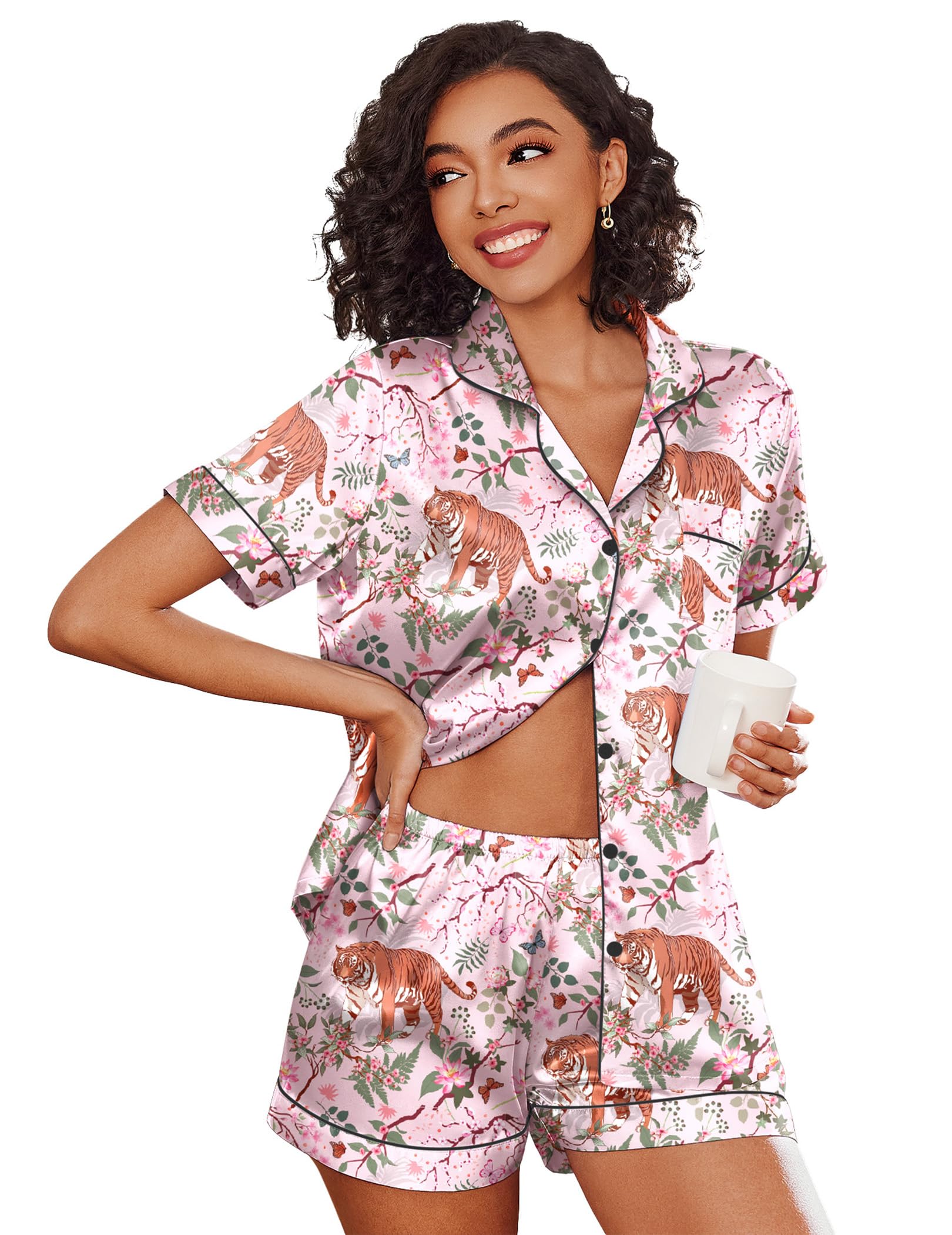 Pajama Top:Sleepwear for women with short sleeve,notch collar,button up pjs top and one chest pocket design.Skin-friendly satin pajamas for women which is great for sleeping,casual wear or lounging